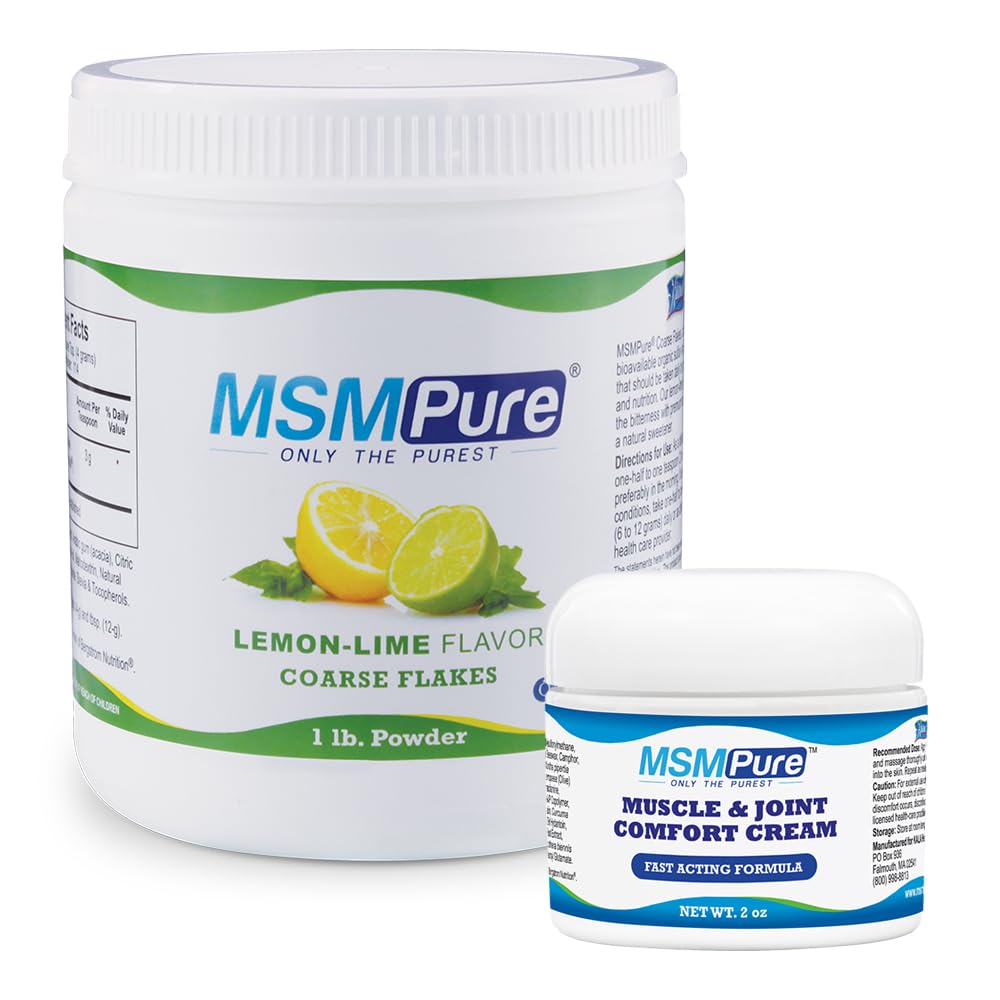 MSM Cream: Heating Sensation: After absorption, experience a gentle warming effect that enhances the feeling of comfort. MSM Cream: Fast-Acting Formula: Absorbs quickly into the skin, offering effective relief in no time. MSM Cream: Maximum Strength MSM: Features a high concentration of MSM, designed to provide soothing comfort to muscles and joints. MSM Powder: Supports Joint Health Mobility: MSM helps maintain joint function and mobility, promoting collagen production and supporting flexibility and overall joint comfort. MSM Powder: Zesty Lemon Lime Flavor: A lively blend of tangy lemon and refreshing lime that perfectly balances the natural bitterness of MSM, providing a crisp, invigorating taste that brightens your daily routine.