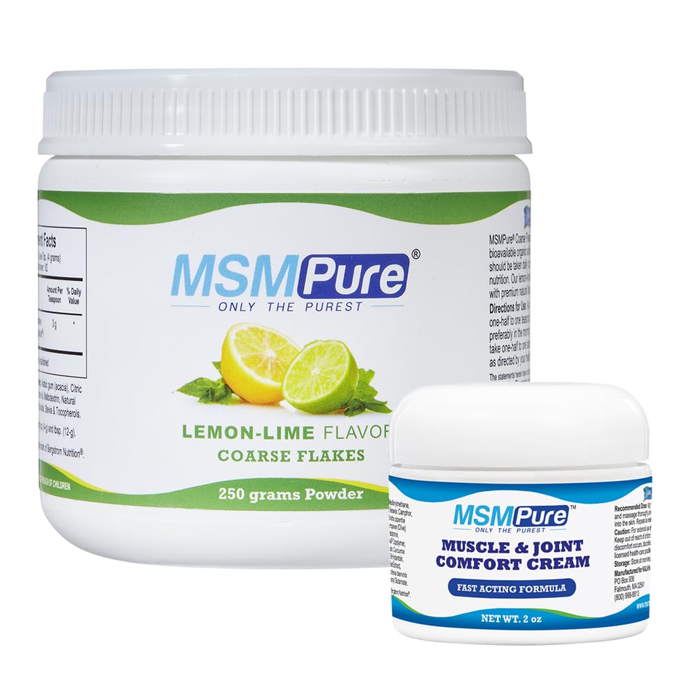 MSM Cream: Fast-Acting Formula: Absorbs quickly into the skin, offering effective relief in no time. MSM Cream: Maximum Strength MSM: Features a high concentration of MSM, designed to provide soothing comfort to muscles and joints. MSM Powder: Supports Joint Health Mobility: MSM helps maintain joint function and mobility, promoting collagen production and supporting flexibility and overall joint comfort. MSM Powder: Zesty Lemon Lime Flavor: A lively blend of tangy lemon and refreshing lime that perfectly balances the natural bitterness of MSM, providing a crisp, invigorating taste that brightens your daily routine.