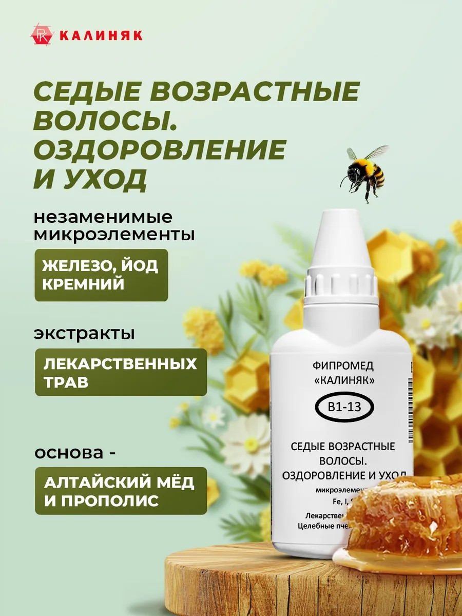 Fipromed Kalinyak B1-13 is a revolutionary solution that combats the causes of age-related changes, slows the appearance of gray hair, and restores hair health.