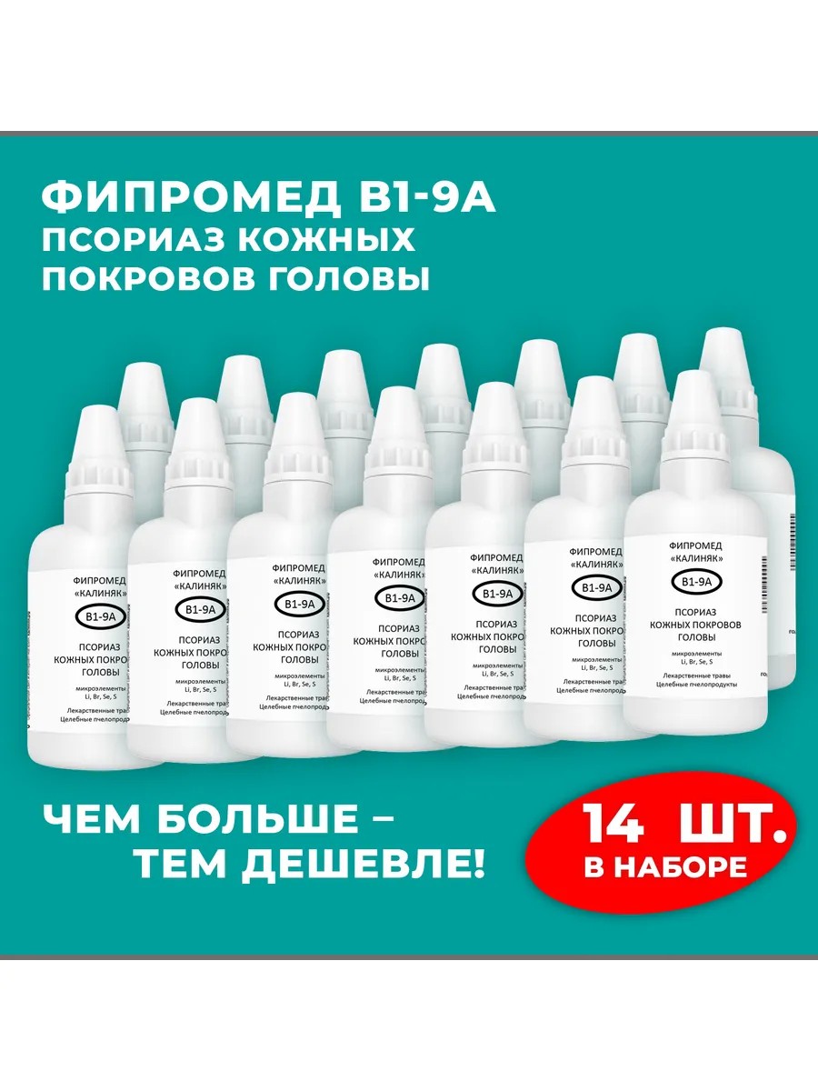 | Полное наименование товара | Фипромед Калиняк В1-9А Псориаз кожных покровов головы, 14 шт. по 50 мл |