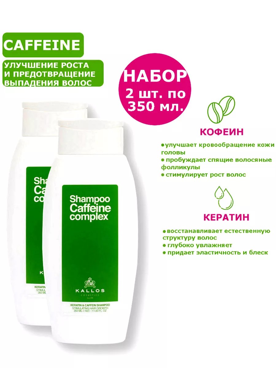 В наборе 2 шампуня по 350 мл. каждый. Шампунь Kallos Caffein&Keratin разработан для бережного очищения тонких, поврежденных и ослабленных волос. Уникальная формула продлевает цикл роста волос, делая их плотными, густыми, с красивым богатым блеском! Входящий в состав кофеин стимулирует кровообращение кожи головы и волосяных фолликул, тем самым уменьшая и предотвращая выпадение волос. Благодаря содержанию кератина шампунь регенерирует, увлажняет и восстанавливает естественную структуру волос. При постоянном использовании волосы становятся послушными, блестящими и мягкими на ощупь. Для достижения лучшего эффекта рекомендуем использовать вместе с маской в комплексе. Способ применения: массирующими движениями нанести шампунь на влажные волосы и кожу головы. Оставить на 3 минуты. Смыть обильным количеством воды.