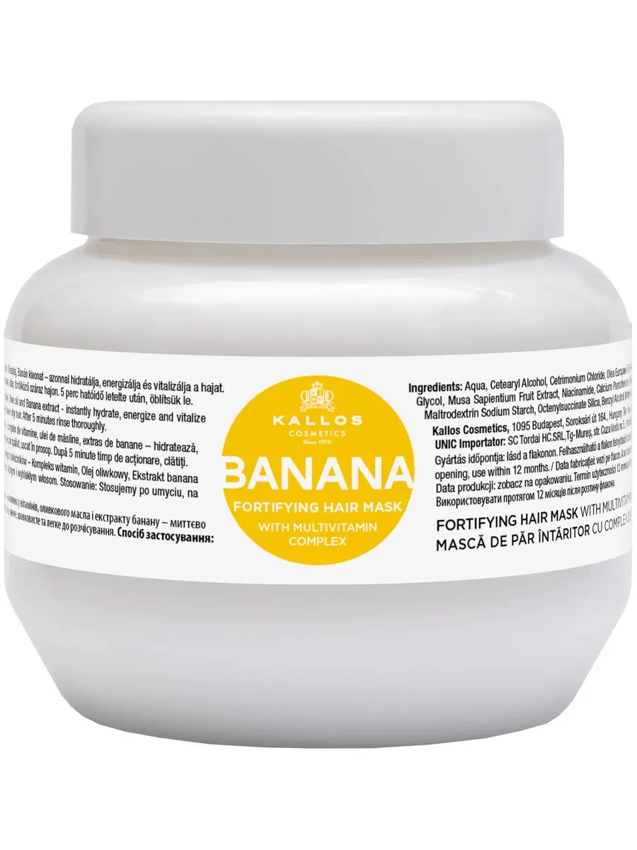 Banana Hair Mask from the Hungarian professional cosmetics brand Kallos Cosmetics is a specially formulated mask for strengthening and nourishing hair with a multivitamin complex, banana extract, and olive oil.