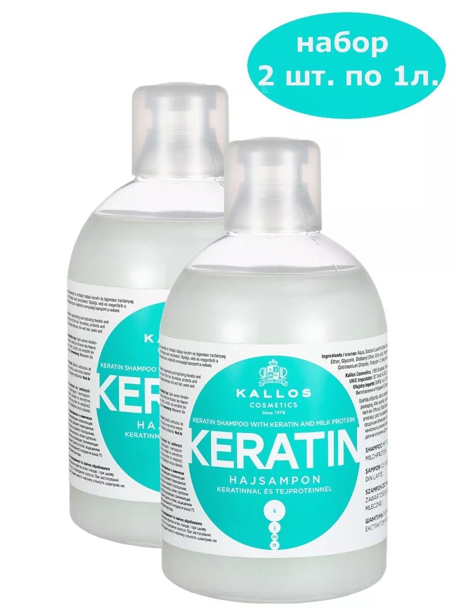 В наборе 2 шампуня по 1 литру каждый. Шампунь Keratin - это шампунь с кератином и молочным протеином для сухих, поврежденных и химически обработанных волос. Благодаря содержанию кератина и экстракта молочного протеина, шампунь с восстанавливающим и увлажняющим эффектом мягко очищает и при этом регенерирует естественную структуру волос, заполняет повреждения кутикулы. Питает, защищает и укрепляет сухие, поврежденные волосы. При использовании волосы становятся послушными, мягкими на ощупь и блестящими. Минимальное содержание сульфатов позволяет использовать данный продукт людям с чувствительной кожей. Товар сертифицирован на территории ЕАЭС.