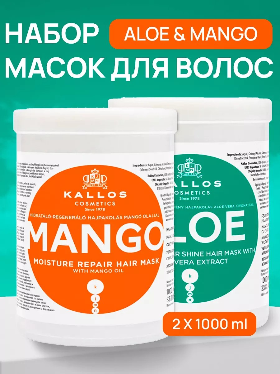 The set consists of two masks, each holding 1 liter. 1. Mango Mask is a moisturizing mask for dry, damaged, and chemically treated hair with mango butter. Rich in vitamins and nutrients, this mask is perfect for nourishing, softening, and hydrating hair. It restores and maintains hair health, supporting the hydrolipid balance of the skin and hair. It stimulates hair growth, leaving it soft, shiny, and elastic. Mango butter creates an invisible shell around the hair, protecting it from dehydration and damage. Directions: Apply a small amount of the mask to clean, damp hair, leave it on for 5 minutes, then rinse with warm water. 2. Aloe Mask is a moisturizing mask for restoring shine to dry, lifeless, and damaged hair with Aloe Vera extract. Instantly moisturizes and nourishes dry and damaged hair. Nourishes hair, while the active ingredient Aloe Vera—rich in vitamins and minerals—promotes hair growth, silkiness, radiant shine, and volume. Directions: Apply a small amount to clean, damp hair, leave on for 5 minutes, then rinse with warm water. This product is certified in the Eurasian Economic Union (EAEU).