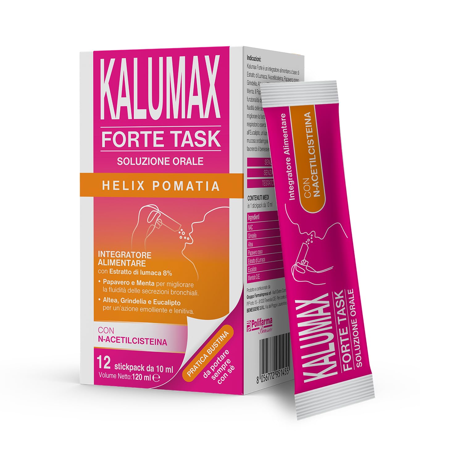 Kalumax Forte is a food supplement based on snail extract, N-acetylcysteine, red poppy, grindelia, althea, and essential oils of eucalyptus and mint. Poppy, along with mint, supports the function of the upper respiratory tract and improves the fluidity of bronchial secretions. Althea is helpful in improving the function of the respiratory mucous membranes by exerting, with grindelia and eucalyptus, a soothing and calming effect on the oropharyngeal mucosa, improving voice tone and promoting the well-being of the nose and throat. INGREDIENTS Water, fructose, snail extract, N-acetylcysteine, acidity regulator: sodium hydroxide red poppy essential oil. (Papaver rhoeas L., flos), glyceric grindelia (Grindelia robusta Nutt., herba cum floribus), emulsifier: polysorbate 80, acacia gum, xanthan gum hydroglyceric althaea (Althaea officinalis L., radix), eucalyptus (Eucalyptus calyptus globulus Labill., folium) essential oil, flavoring, preservatives: potassium sorbate, sodium benzoate acidity regulator: citric acid peppermint (Mentha x poivrée L., summitas cum floribus) essential oil. Apple fragrance. SAFETY WARNING For external use only. Avoid contact with eyes. Keep away from direct flame or heat source. See moreWhy choose Kalumax? Kalumax stands for quality. Manufactured to high standards, gluten-free and lactose-free, and nickel-tested, this product is ideal for the whole family. Kalumax Forte TASK comes in convenient sachets to take with you wherever you go. Storage: Store at a temperature between 5 C and 25 C in a dry place. Avoid exposure to heat sources and sunlight. The minimum shelf life refers to the product when properly stored in its original packaging. Keep the product in its original packaging. Warnings: Keep out of reach of children under 3 years of age to prevent accidental ingestion. Do not exceed the recommended daily dose. Food supplements should not be used as a substitute for a varied and balanced diet and a healthy lifestyle. Kalumax X FORTE TASK is available in convenient sachets to always have with you, even when you're out and about. Convenient pocket-sized: Kalumax Forte Task is enriched with poppy and mint to improve the flow of bronchial secretions, plus the addition of marshmallow, saffron, and eucalyptus for a soothing effect on the oropharyngeal mucosa. All this comes in convenient pocket-sized sachets you can take with you everywhere, even outside the home. Is a cough disrupting your routine? Kalumax Forte Task with lemon flavor is designed to meet the needs of adults and children over 3 years old, offering relief from severe dry or chesty coughs. Thanks to its mucolytic formula with snail extract, this supplement promotes relief and optimal recovery.Kaluma x FORTE TASK - un complément alimentairedans des sachets pour la toux sèche et grasse à base d'extrait d'escargot, N-acétylcystéine à action mucolytique émolliente et apaisante.DESCRIPTION DU PRODUIT DESCRIPTION DU PRODUIT Kalumax Forte est un complément alimentaire à base d'extrait d'escargot, de N-acétylcystéine, de coquelicot rouge, de grindelia, d'altea et d'huile essentielle d'eucalyptus et de menthe. Le coquelicot, avec la menthe, soutient la fonctionnalité des premières voies respiratoires et améliore la fluidité des sécrétions bronchiques. L'Altea est utile pour améliorer la fonctionnalité des muqueuses de l'appareil respiratoire en exerçant, avec la Grindela et l'Eucalyptus, une action apaisante et apaisante pour la muqueuse oropharyngée en améliorant le tonus de la voix et en favorisant le bien-être du nez et de la gorge. INGRÉDIENTS Eau, fructose, extrait d'escargot, N-acétylcystéine, régulateur d'acidité : hydroxyde de sodium coquelicot rouge e.s. (Papaver rhoeas L., flos), grindelia e. glycérique (grindelia robuste nutt., herba cum floribus), émulsifiant : polysorbate 80, gomme d'acacia, gomme de xantane Altea e. hydroglycérique d:e 1:2 (Althaea officinalis L., radix), huile essentielle d'eucalyptus (Eucalyptus (Eucalyptus calyptus globulus Labill., folium), arôme, conservateurs : sorbate de potassium, benzoate de sodium régulateur d'acidité : acide citrique huile essentielle de menthe (mentha x poivrée L., summitas cum floribus). Parfum pomme AVERTISSEMENT DE SÉCURITÉ Usage extérieur uniquement. Évitez tout contact avec les yeux. Tenir à l'écart de la flamme nue directe ou de la source de chaleur. Voir plusPourquoi choisir Kalumax ? : Kalumax est synonyme de qualité. Fabriqué avec des normes élevées, sans gluten ni lactose, testé au nickel, ce produit est idéal pour toute la famille. Kalumax Forte TASK est dans des sachets pratiques à emporter partout avec vous. Conservation : conserver à une température comprise entre 5 C et 25 C dans un endroit sec. Évitez l'exposition à des sources de chaleur et aux rayons du soleil. La durée minimale de conservation se réfère au produit correctement conservé dans son emballage intégré. Conserver le produit dans son emballage d'origine. Avertissements : Tenir hors de portée des enfants de moins de 3 ans afin d'éviter la prise accidentelle du produit. Ne pas dépasser la dose quotidienne recommandée. Les compléments alimentaires ne doivent pas être considérés comme un substitut d'une alimentation variée, équilibrée et d'un mode de vie sain. Kaluma X FORTE TASK est disponible en sachets pratiques à avoir toujours avec soi même en dehors de la maison. Poche confortable : Kalumax Forte Task est enrichi en coquelicot et menthe pour améliorer la fluidité des sécrétions bronchiques, en plus de l'ajout d'Altea, de Grindelle et d'eucalyptus pour une action apaisante sur la muqueuse oropharyngée, tout inclus dans des sachets de poche pratiques à emporter partout avec vous, même en dehors de la maison. La toux dérange votre routine ? Kalumax Forte Task au goût de citron est étudié pour répondre aux besoins des adultes et des enfants de plus de 3 ans, offrant un soulagement de la toux forte