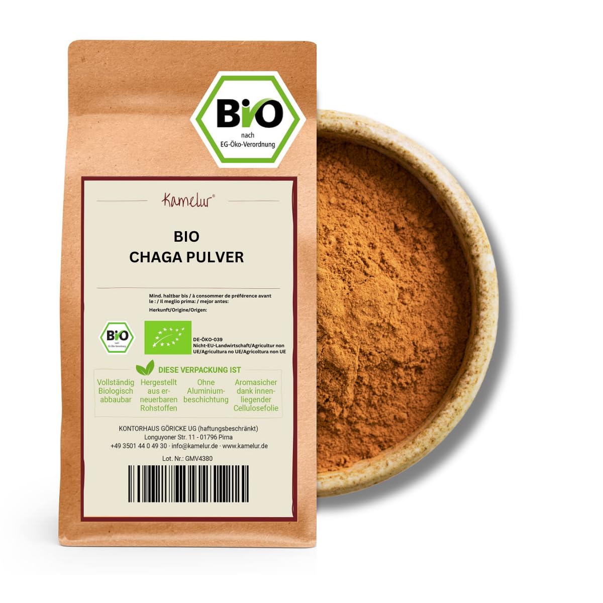 Organic Chaga Powder INGREDIENTS Chaga mushroom (Inonotus obliquus) from certified organic farmingBuy now: You want to receive our organic chaga powder quickly and reliably – then press "Buy now". Environmentally friendly packaging: Our organic Chaga mushroom powder comes in completely biodegradable packaging. It was made from 100 renewable raw materials. Thanks to the inner coating, the mushroom powder stays fresh and aromatic for longer. USE: It is easy to use and can be added to smoothies, juices, teas or other favorite drinks. 100 natural: You will receive our Chaga mushroom powder from controlled organic cultivation. Our premium organic mushrooms are gently harvested, cleaned, gently dried and finely ground. Poudre de chaga biologique INGRÉDIENTS Chaga champignon (Inonotus obliquus) issu de l'agriculture biologique contrôléeAchetez maintenant : vous voulez recevoir notre poudre de chaga bio rapidement et de manière fiable – puis appuyez sur « Acheter maintenant ». Emballage respectueux de l'environnement : notre poudre de champignon Chaga bio est livrée dans un emballage entièrement biodégradable. Il a été fabriqué à partir de matières premières 100 renouvelables. Grâce au revêtement intérieur, la poudre de champignon reste fraîche et aromatique plus longtemps. UTILISATION : il est facile à utiliser et peut être ajouté à des smoothies, des jus, des thés ou d'autres boissons préférées. 100 naturel : vous recevrez notre poudre de champignon Chaga issue de l'agriculture biologique contrôlée. Nos champignons bio de qualité supérieure sont récoltés en douceur, nettoyés, séchés doucement et finement broyés.