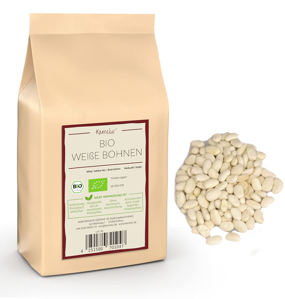 Kamelur 1kg BIO weiße Bohnen getrocknet – getrocknete Bohnen BIO ohne Zusätze – weisse Bohnen in biologisch abbaubarer Verpackung