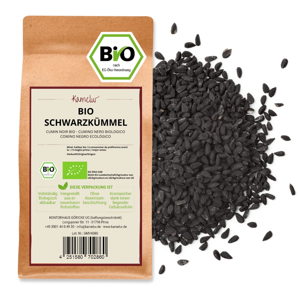 BUY NOW: If you want our black cumin seeds delivered to you quickly and reliably, then click "Buy this item." ECO-FRIENDLY PACKAGING: Our organic nigella seeds come in fully biodegradable packaging. This packaging is made from 100 renewable resources. Thanks to the inner lining, this spice stays fresh and aromatic for longer. VERSATILE: Our organic nigella is suitable for seasoning various curry dishes. The black seeds are also well-suited to fried vegetables such as zucchini or cabbage. When roasted, they make a visually appealing and flavorful addition to baked goods or salads. Black cumin seeds are also an important ingredient in various spice blends. Black cumin is also suitable for preparing a soothing tea. AROMATIC: Black cumin (Nigella sativa) is not related to cumin or caraway, and its flavor is also different from these spices. It has a warm, spicy aroma with a nutty note. Due to its pleasant spiciness, it is often used as a substitute for mild pepper. 100 NATURAL: You will receive our whole, carefully dried black cumin seeds, grown using controlled organic methods and without any additives.