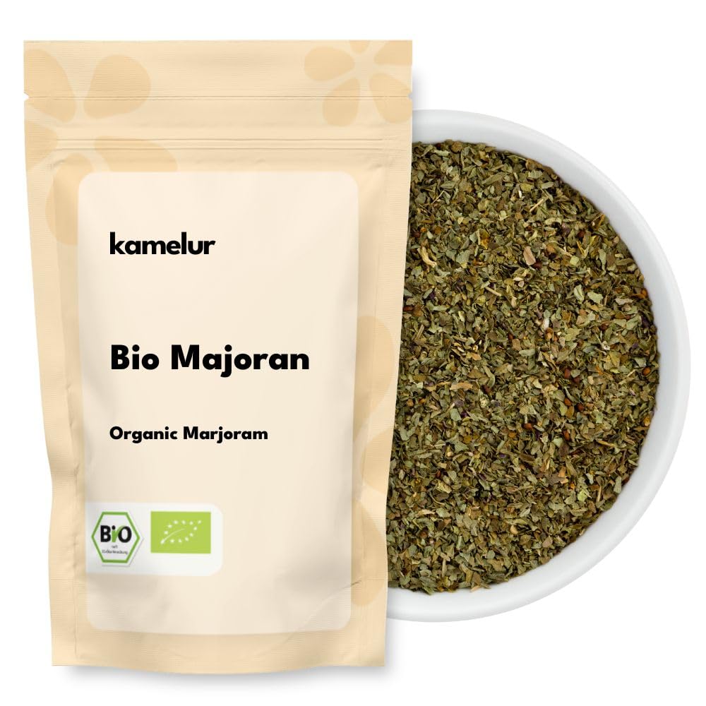 Kamelur 250g of dried and grated organic marjoram - organic aromatic spice - ideal for seasoning bratwurst sausages - in biodegradable packaging
