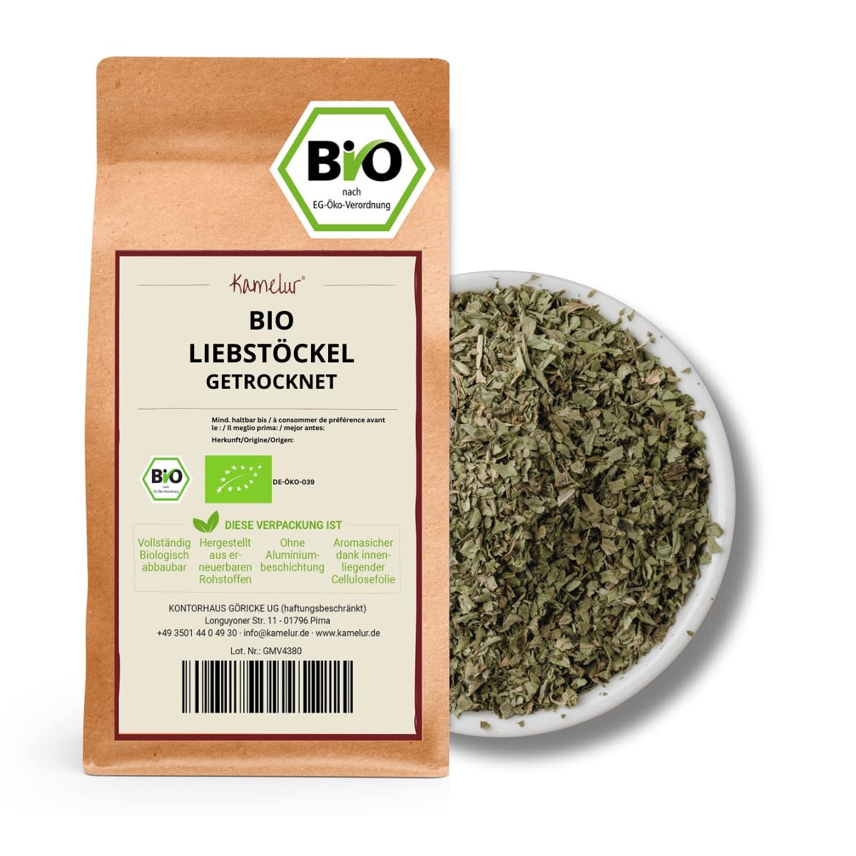 Like all our other spices, our organic lovage leaves contain no additives. Make your own seasoning with lovage! Our Maggi herb is essential in every good stew. Dried and chopped lovage leaves from certified organic farming in Kamelur.Comme toutes nos autres épices, nos feuilles de livèche bio ne contiennent aucun additif. Préparez votre propre assaisonnement avec de la livèche!. Notre herbe à maggi est indispensable dans tous les bons ragoûts. Feuilles de livèche séchées et hachées issues de l'agriculture biologique contrôlée de Kamelur.