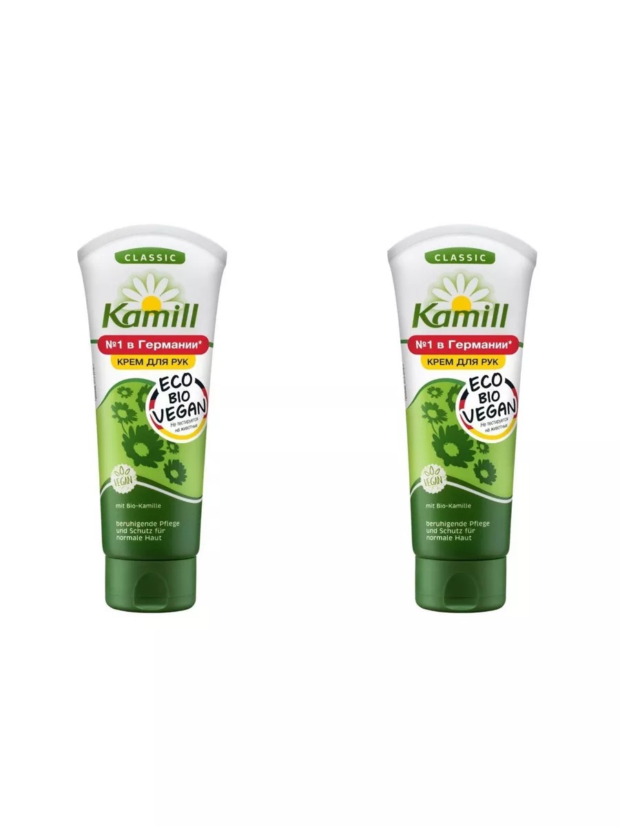 KAMILL Classic Hand and Nail Cream - soothing care, protection, and hydration for normal to dry skin. The cream's soft, ultra-gentle texture softens and moisturizes the skin, absorbs beautifully, and leaves hands feeling velvety smooth. Ideal for daily use. Dermatologically tested. Contains organic chamomile extract (organic chamomile from controlled plantations) and bisabolol. NO dyes, parabens, PEG emulsifiers, mineral oils, paraffin, or animal-derived ingredients. 2 in a set.