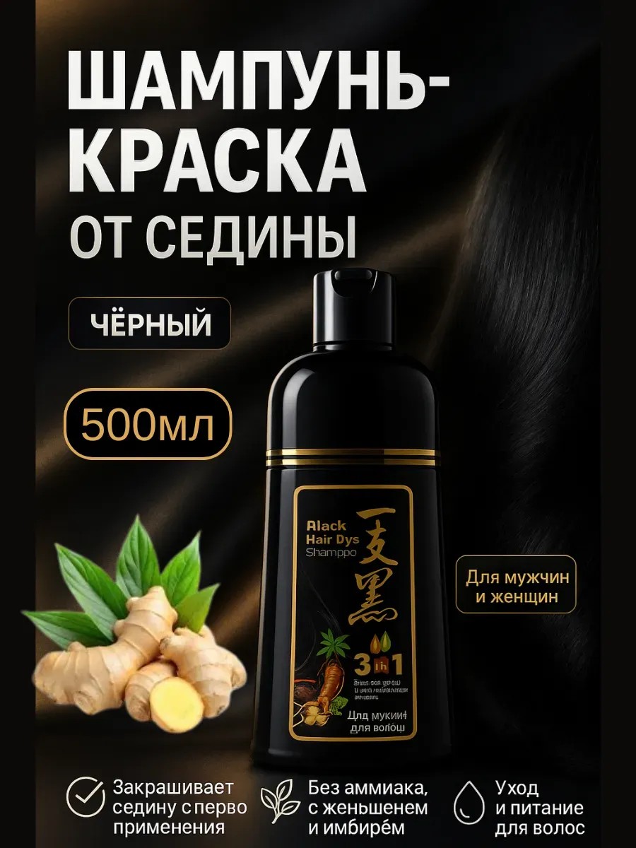 Красящий шампунь для волос 3 в 1 — это простое и удобное решение для тех, кто хочет быстро и эффективно закрасить седину и восстановить насыщенный чёрный цвет волос. Благодаря натуральному составу с женьшенем, имбирём, травами и ухаживающими маслами, средство не только окрашивает, но и укрепляет волосы по всей длине. Шампунь придаёт глубокий цвет, блеск и мягкость, не повреждая структуру волос и не раздражая кожу головы.