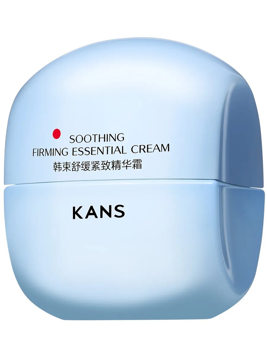 Крем для лица KANS в голубой баночке из линейки Soothing Firming Essential – эффективное средство для завершающего этапа ухода за чувствительной кожей лица с первыми признаками возрастных изменений (30+), мелкими мимическими морщинами, потерей упругости и сияния.