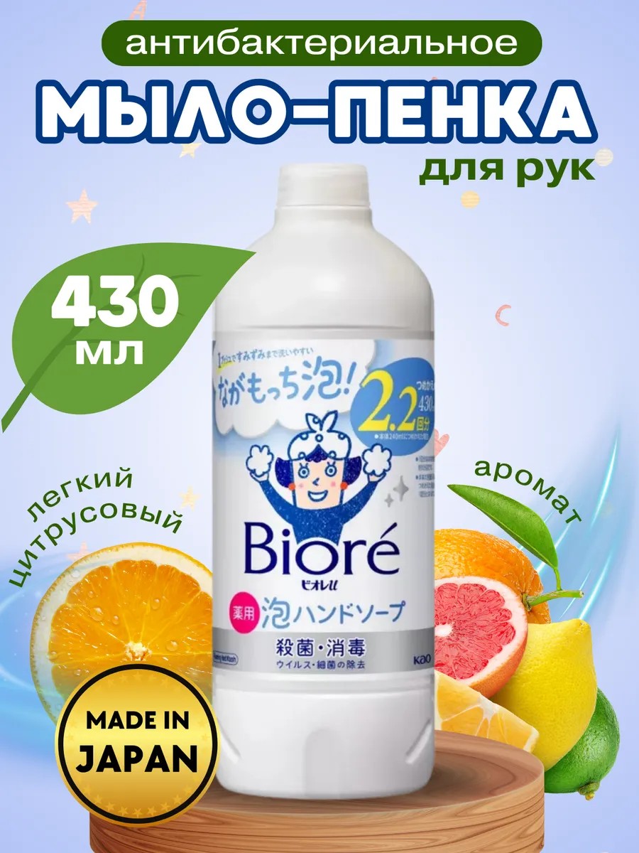 Мыло-пенка для рук KAO Biore U Foaming Hand Soap с антибактериальным эффектом, с легким цитрусовым ароматом, запасной флакон для диспенсера 430мл
