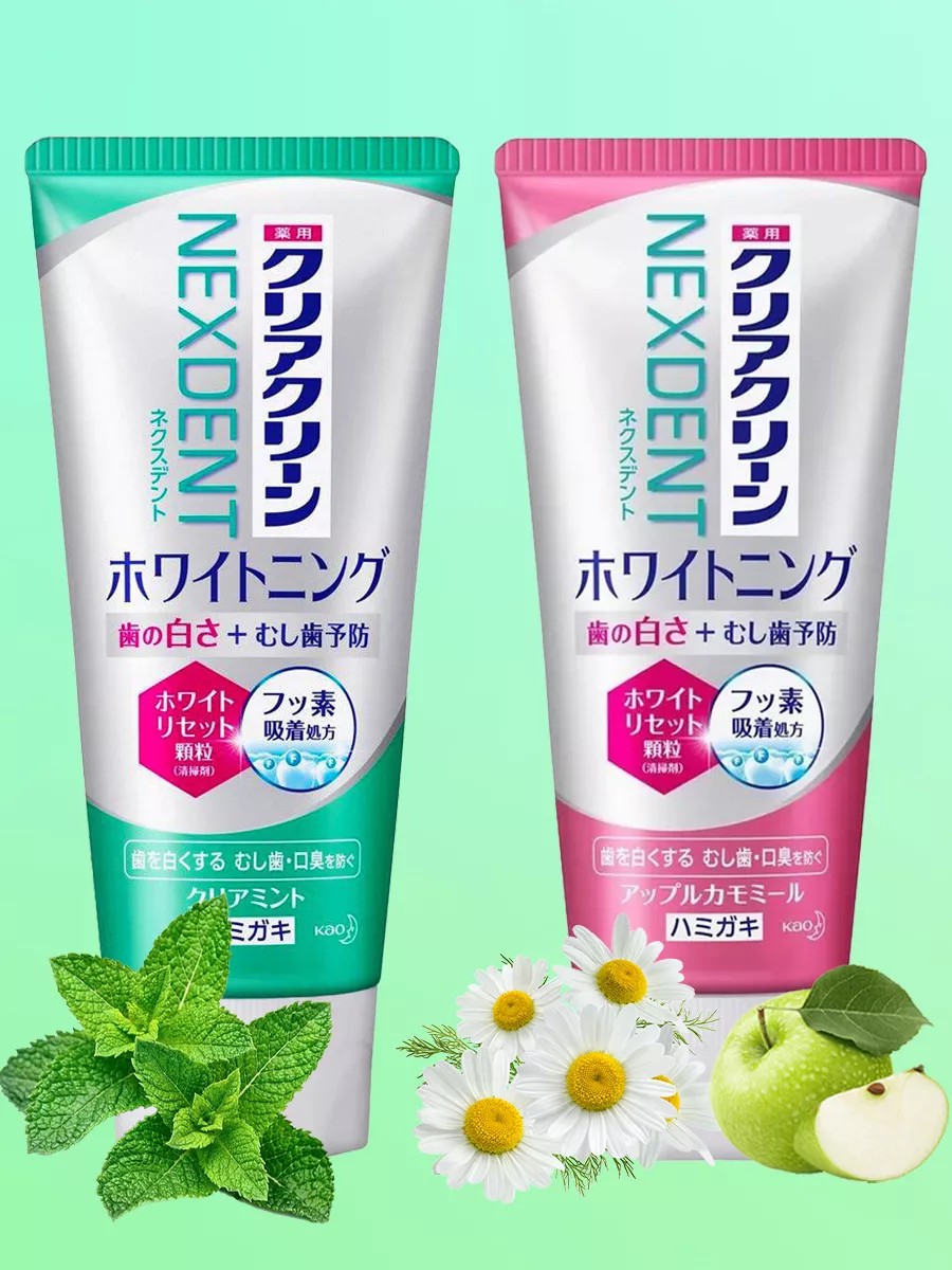 1) Лечебно-профилактическая зубная паста с микрогранулами KAO Clear Clean Nexdent Whitening Apple Chamomile, отбеливающая, с ароматом яблока и ромашки, туба 120гр. х 1шт.