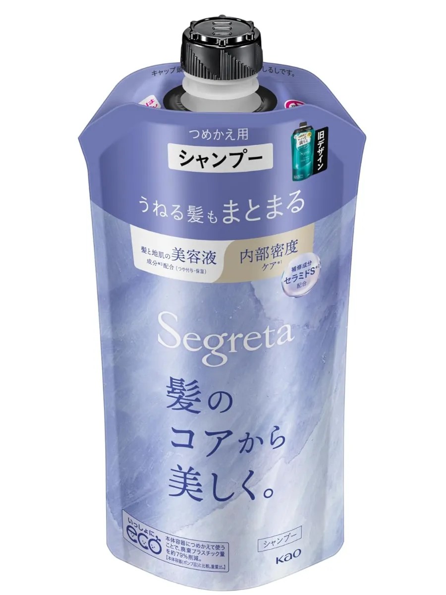 KAO Segreta Smoothness and Shine Japanese Shampoo for Wavy Hair, Scented with Yuzu Blossoms, Cedar, and Fresh Greens, 340ml. Your secret to beautiful and youthful hair! With age, hair loses lipids, which leads to the formation of voids, brittleness, and loss of shine in wavy and curly hair. Shampoo with ceramide S and lanolinic acid deeply penetrates the hair cuticle and restores the lipid layer, smoothes wavy hair, reduces frizz and split ends, and ensures easy styling. 6 extracts - rosehip, pomegranate, rose, royal jelly, soy and eucalyptus, malic and succinic acids - moisturize the hair and scalp, add shine. Silicone-free. Suitable for mature, frizzy wavy hair. Scented with yuzu flowers with notes of cedar and fresh greens. Directions: Wet hair, apply shampoo directly to the scalp, work into a lather, and massage in, concentrating on the area behind the ears and the back of the head. Distribute the lather through the lengths of the hair. Rinse thoroughly with water. For maximum results, use with the Segreta conditioner and balm. Ingredients: Water, Ammonium Laureth Sulfate, Sodium Laureth Sulfate, Ethanol, Lauryl Hydroxysultaine, Toluenesulfonic Acid, PPG-3 Caprylyl Ether, Bis-Methoxypropylamide Isodoxane, Rosa Canina Fruit Extract, Punica Granatum Fruit Extract, Rosa Centifolia Flower Water, Royal Jelly Extract, Soja (Soybean) Seed Extract, Eucalyptus Globulus Leaf Extract, Malic Acid, Succinic Acid, Lanolin Fatty Acid, Polyquaternium-10, PEG-60 Hydrogenated Castor Oil, Stearyl Alcohol, Stearoxypropyl Dimethylamine, BG, Lauramidopropyl Betaine, Ethylhexylglycerin, Sodium Cocoamphoacetate, DPG, Steareth-6, Laureth-3, Laureth-16, Sodium Hydroxide, Potassium Hydroxide, EDTA-3Na, phenoxyethanol, sodium benzoate, fragrance.