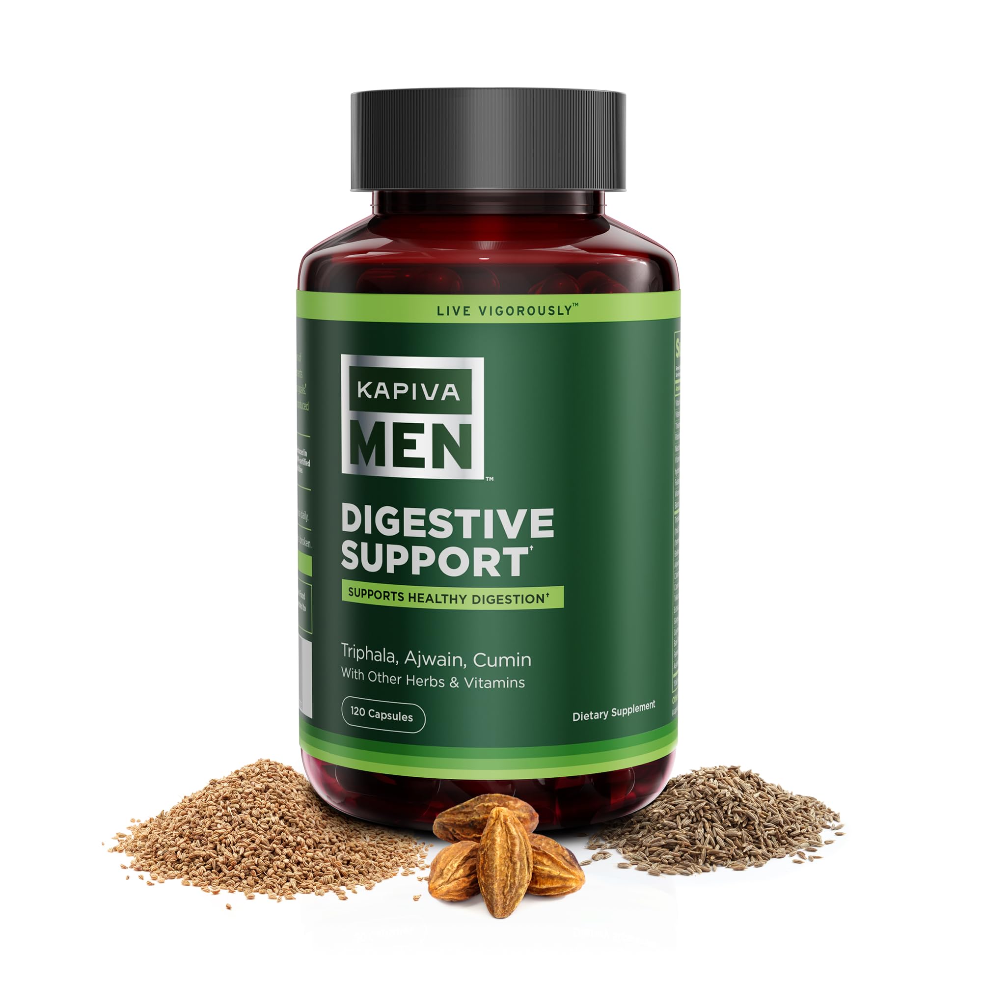SUPERIOR QUALITY SAFETY: Crafted in GMP-certified facilities, our products undergo rigorous testing for identity and potency. Clinically tested for safety and efficacy using recognized protocols. GREAT VALUE: 60 days of supply in each bottle makes for a great value (120 capsules - take one easy-to-swallow capsule twice daily). CRAFTED FOR MEN: Unlike other products, Kapiva Men's products are specially formulated for men's top wellness goals. This product is tailored to complement your lifestyle and to aid in gut health. . ENHANCED NUTRIENT ABSORPTION: The potent inclusion of vitamin B6 and B12 have demonstrated efficacy in helping break down food and transport nutrients for fast absorption. . AYURVEDIC DIGESTIVE SUPPORT: Harness the digestive-supporting benefits of our triphala blend and ajwain. Triphala is a powerful detoxifier and also helps strengthen and tone the tissues of the colon, which helps support healthy digestion. Active enzymes in ajwain can improve the flow of stomach acids, which helps relieve indigestion, bloating, and gas. Our additional herbs add an extra layer of benefits making this an excellent complement to a daily probiotic. . PREMIUM HERBAL BLEND: Kapiva Men Digestive Support combines the power of premium Ayurvedic herbs and minerals known for stimulating digestive enzymes with science-backed vitamins to create a comprehensive, synergistic approach to healthy digestion. .