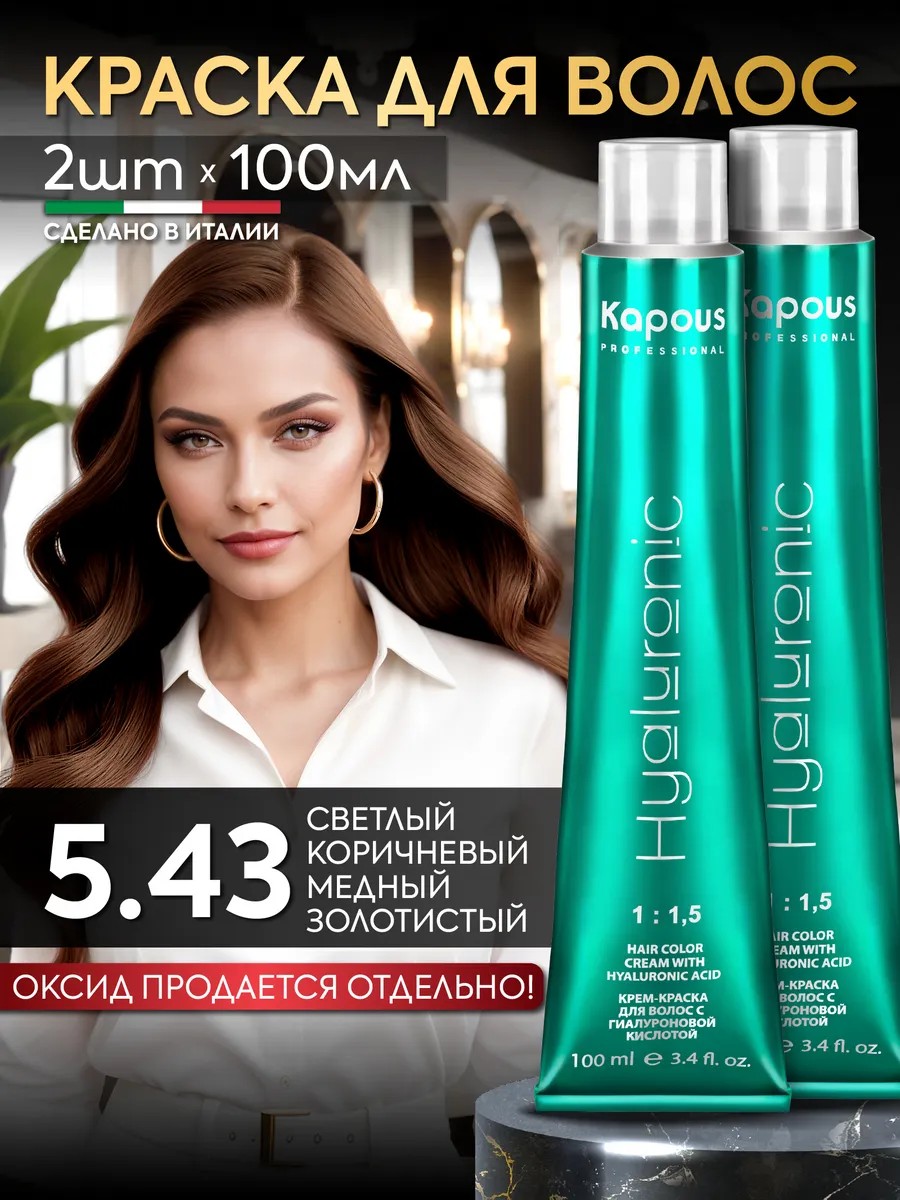 Набор краски из 2шт. Профессиональная стойкая краска для волос с аммиаком и гиалуроновой кислотой в оттенке Светлый коричневый медный золотистый 5.43 бренда Капус. Производство Италия.