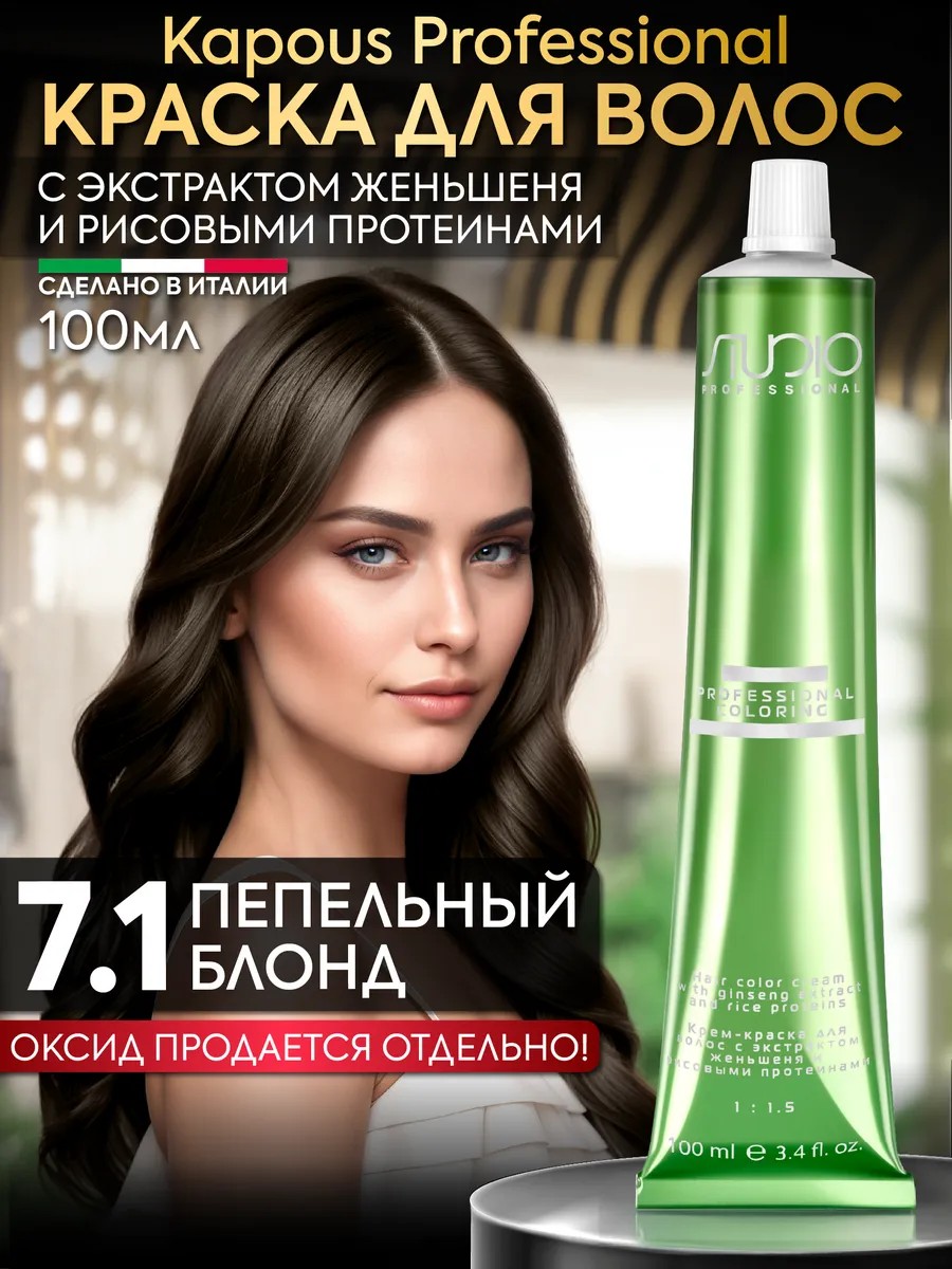 Профессиональная стойкая краска для волос Kapous Professional с аммиаком, женьшенем и рисовыми протеинами в оттенке Пепельный блонд 7.1 бренда Капус. Производство Италия.