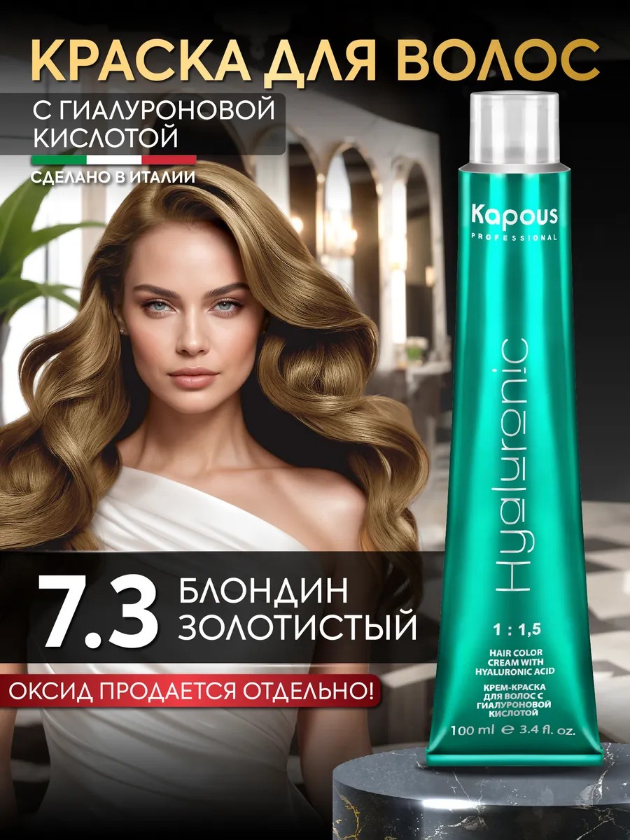 Профессиональная стойкая краска для волос Kapous Professional с аммиаком и гиалуроновой кислотой в оттенке Блондин золотистый 7.3 бренда Капус. Производство Италия.