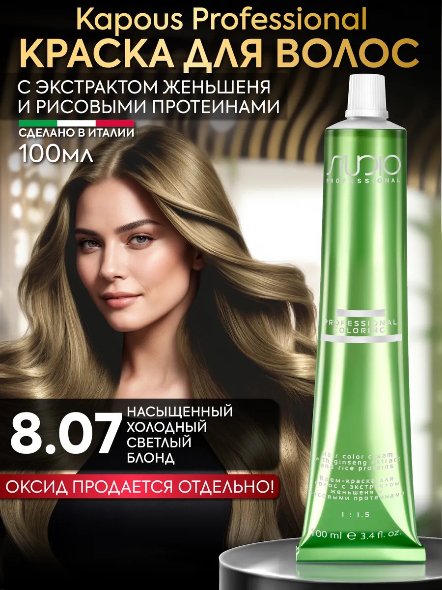 Профессиональная стойкая краска для волос Kapous Professional с аммиаком, женьшенем и рисовыми протеинами в оттенке Насыщенный холодный светлый блонд 8.07 бренда Капус. Производство Италия.