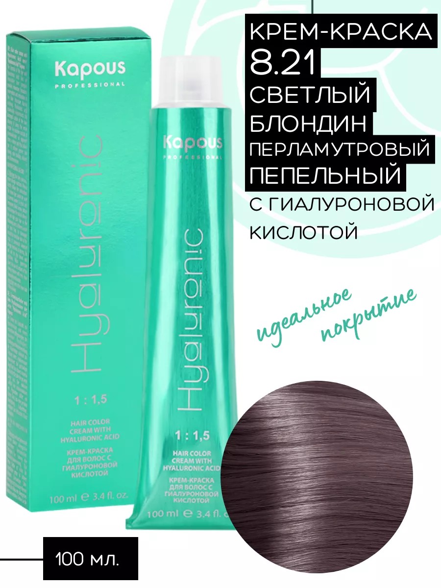 Профессиональная краска для волос Kapous 8.21 Светлый блондин перламутровый пепельный обладает новой революционной формулой. Стойкий краситель Капус Hyaluronic Acid светло русый перламутр холодный включает в состав низкомолекулярную гиалуроновую кислоту и инновационный ухаживающий комплекс, которые обеспечивают максимальное увлажнение, сохранение и восстановление структуры волос при окрашивании. Гиалуроновая кислота максимально реконструирует поврежденную кутикулу волос, выравнивая его по всей длине. Эксклюзивный коктейль микромолекул пигментов образуют плотную сетку, которая позволяет достичь идеального покрытия волос с эффектом ламинирования, стойкости цвета, шелковистости и бриллиантового блеска после окрашивания.