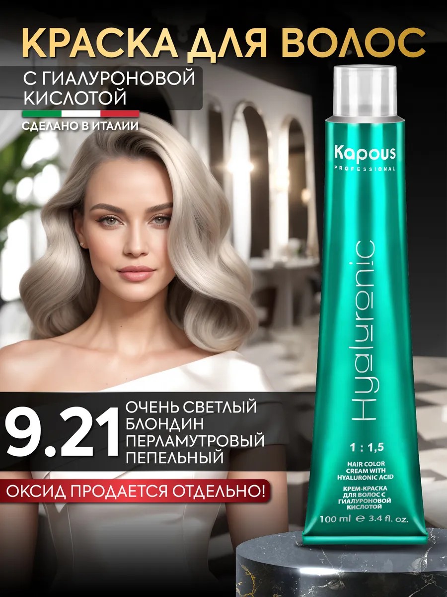 Профессиональная стойкая краска для волос с аммиаком и гиалуроновой кислотой в оттенке Очень светлый блондин перламутровый пепельный 9.21 бренда Капус. Производство Италия.