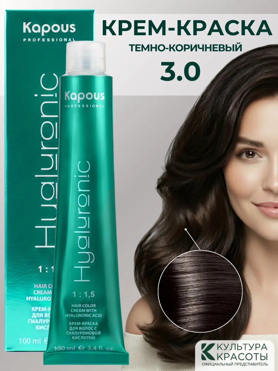 Профессиональная краска для волос Kapous Hyaluronic 3.0 Тёмно-коричневый обладает новой революционной формулой. Этот оттенок отлично подойдёт для тех, кто ищет насыщенный тёмно-русый, тёмно-каштановый или классический каштановый цвет — альтернатива для тех, кому близки такие тона, как краска для волос горький шоколад или краска для волос черная. Стойкий краситель Капус Hyaluronic Acid включает в состав низкомолекулярную гиалуроновую кислоту и инновационный ухаживающий комплекс, которые обеспечивают максимальное увлажнение, сохранение и восстановление структуры волос при окрашивании. Гиалуроновая кислота максимально реконструирует повреждённую кутикулу волос, выравнивая его по всей длине. Эксклюзивный коктейль микромолекул пигментов образует плотную сетку, которая позволяет достичь идеального покрытия волос, включая окрашивание седых волос с эффектом ламинирования, стойкости цвета, шелковистости и бриллиантового блеска после окрашивания.