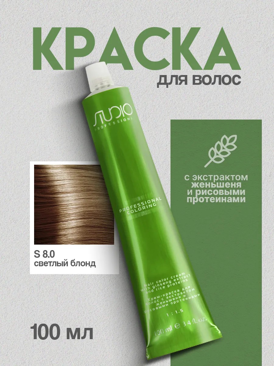 Kapous Studio Professional Cream Hair Color, Shade 8.0 Light Blonde. This professional hair color is designed for long-lasting, high-quality coloring of natural, gray, and previously colored hair. The color does not contain an oxidizer, allowing you to customize the developer based on the desired color intensity and hair type. Light Blonde 8.0 is a pure, natural light shade without yellow tones. A balanced system of components ensures even coverage and long-lasting coloring results. The updated Kapous Studio formula contains ginseng extract and rice proteins, which provide a moisturizing and caring effect, protecting hair from the negative effects of UV rays and maintaining its shine and elasticity. This professional cream hair color is suitable for both men and women. By choosing Kapous Studio, you receive professional-quality coloring, gentle hair care, and a long-lasting, natural Light Blonde shade.