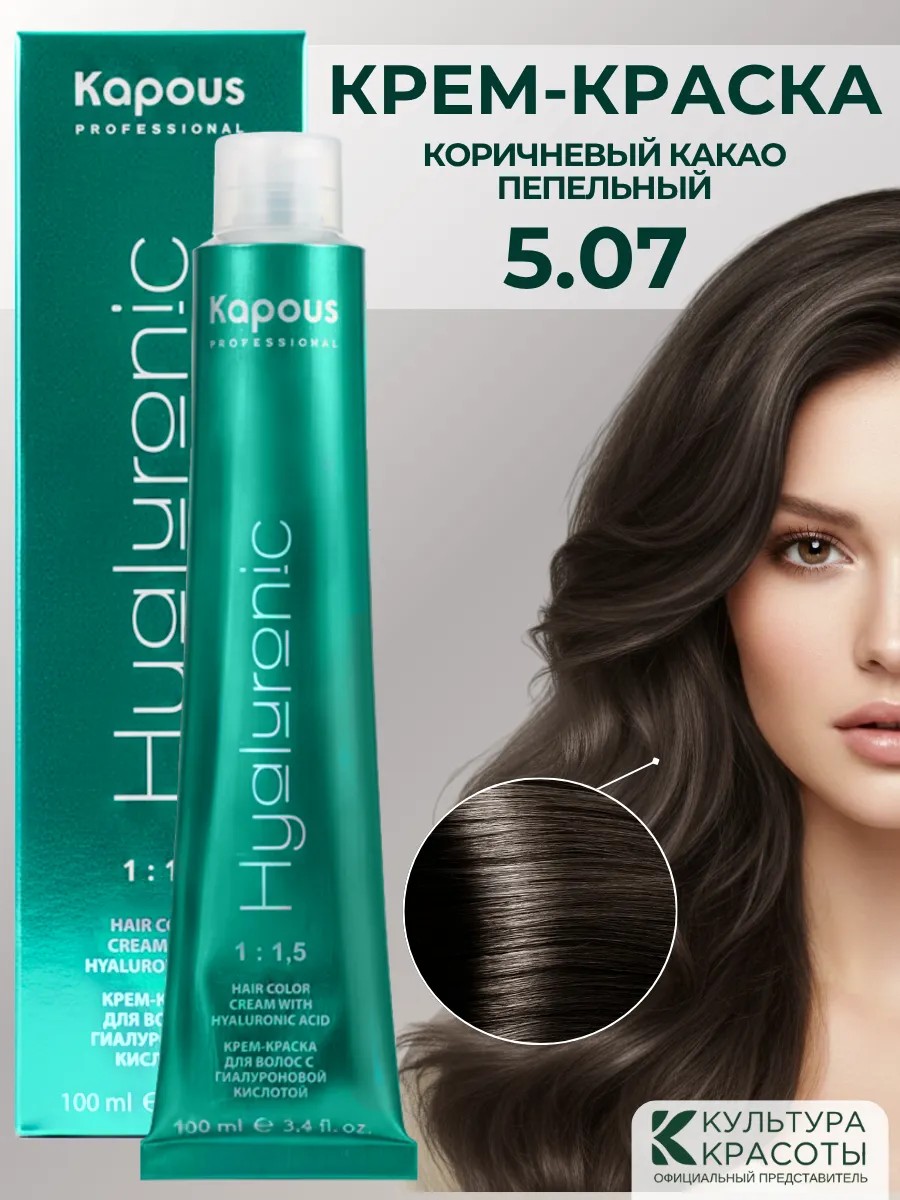 Профессиональная краска для волос Kapous 5.07 Светлый коричневый натуральный холодный обладает новой революционной формулой. Стойкий краситель Капус Hyaluronic Acid холодный каштан включает в состав низкомолекулярную гиалуроновую кислоту и инновационный ухаживающий комплекс, которые обеспечивают максимальное увлажнение, сохранение и восстановление структуры волос при окрашивании. Гиалуроновая кислота максимально реконструирует поврежденную кутикулу волос, выравнивая его по всей длине. Эксклюзивный коктейль микромолекул пигментов образуют плотную сетку, которая позволяет достичь идеального покрытия волос с эффектом ламинирования, стойкости цвета, шелковистости и бриллиантового блеска после окрашивания.