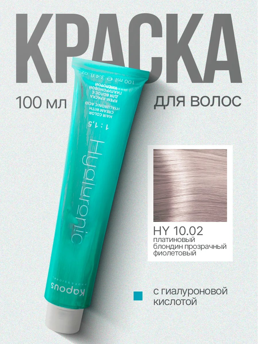 Kapous Professional Hyaluronic Acid 10.02 hair dye with hyaluronic acid in a platinum blonde/transparent violet shade. This professional, original hair dye is sold without oxidizer, as the oxidizer is individually selected based on the desired shade. Hyaluronic Acid cream hair dye is suitable for men and women who value maintaining hair quality during coloring. Kapous Professional Hyaluronic Acid 10.02 permanent hair dye contains the active ingredient low-molecular hyaluronic acid, which ensures the hair's quality is maintained during coloring. Hyaluronic acid, contained in this permanent professional hair dye, deeply moisturizes and nourishes the hair structure, reconstructs the damaged cuticle, and reliably protects it from external influences for a certain period. Permanent Hair Color 10.02 contains panthenol, which is essential during chemical treatments. It is an effective moisturizer, imparting incredible softness and protecting hair during thermal styling. This professional cream color with hyaluronic acid is truly long-lasting and covers gray hair well. Kapous Hair Color 10.02 washes out evenly, without a patchy effect. The cream color does not dry out hair, despite being ammonia-based and having a long-lasting pigment. Kapous hair color should be diluted 1:1.5 – this is very economical. Hair should be clean and free of styling products when coloring. Apply Kapous Hair Color with hyaluronic acid to dry hair.