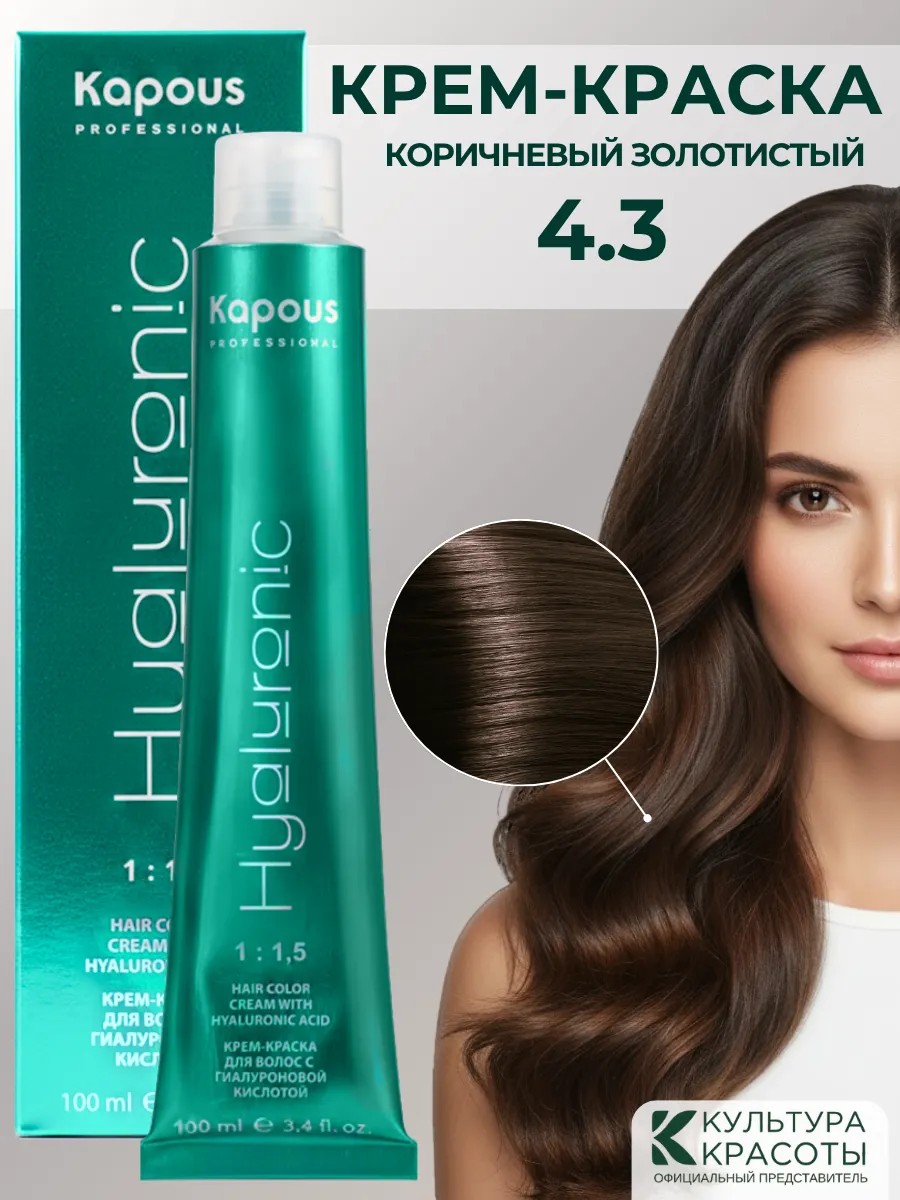 Профессиональная краска для волос Kapous 4.3 Коричневый золотистый обладает новой революционной формулой. Стойкий краситель темный каштан золотой Капус Hyaluronic Acid включает в состав низкомолекулярную гиалуроновую кислоту и инновационный ухаживающий комплекс, которые обеспечивают максимальное увлажнение, сохранение и восстановление структуры волос при окрашивании. Гиалуроновая кислота максимально реконструирует поврежденную кутикулу волос, выравнивая его по всей длине. Эксклюзивный коктейль микромолекул пигментов образуют плотную сетку, которая позволяет достичь идеального покрытия волос с эффектом ламинирования, стойкости цвета, шелковистости и бриллиантового блеска после окрашивания.