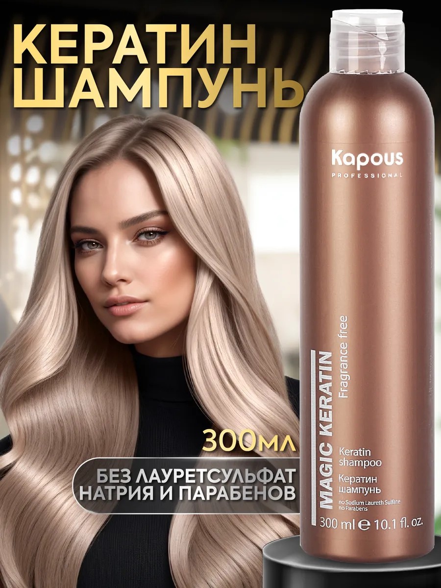 Серия Fragrance free не имеет парфюмированных добавок. Не содержит Натрия Лаурет Сульфатов и парабенов, без sls и sles. Шампунь Magic Keratin для уставших, утративших жизненную силу, химически выпрямленных или завитых волос, а также подверженных неоднократным процедурам окрашивания и обесцвечивания, предназначен для решения трёх важных задач питание и восстановление, лечение поврежденных волос, защита. Комбинация мягких поверхностно-активных веществ деликатно очищает волосы от загрязнений, подготавливая к процедуре более интенсивного восстановления. Благодаря входящим в состав Кератину и фруктовым кислотам питает и защищает поврежденные волосы, придавая жизненную силу и тонус. Модифицированные фруктовые кислоты служат для смягчения волос, увлажняют и придают дополнительный блеск, кератин восстанавливает и придает эластичность.