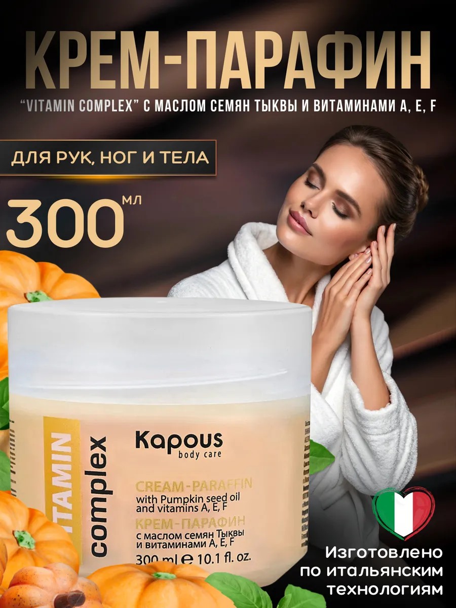 Крем-парафин «HEALTH complex» с маслом семян Тыквы и витаминами A, E, F торговой марки Kapous Professional – предназначен для проведения процедуры холодной парафинотерапии. Оказывает успокаивающее действие на кожу, снимает шелушение и раздражение, избавляет от покраснений и сухости. Содержит натуральное масло семян Тыквы, которое питает и увлажняет кожу, способствует осветлению пигментации. Витаминный комплекс А, Е, F активирует процессы регенерации клеток и придает эластичность коже. Витамин F регулирует водно - липидный баланс кожи. Витамины А и Е работают как антиоксидант. Крем-воск капус для рук и ног - это профессиональная косметика для ухода за кожей, которая специально разработана для предотвращения трещин и увлажнения сухой кожи. Он содержит парафин, который является отличным ингредиентом для холодной парафинотерапии и восстановления кожи. Этот профессиональный косметический боди уход обогащен экстрактом тыквы и представлен в удобном объёме 300 мл. Холодный парафин отлично подходит для профессионального и домашнего использования