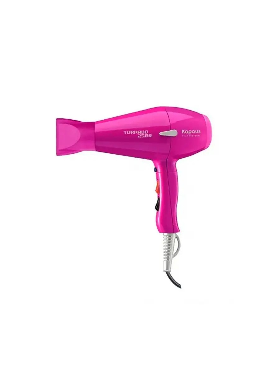 Professional hair dryer with increased power, model Tornado-2500 Kapous Professional. The hair dryer is ideal for long and complex hair styling! Thanks to its power and air flow distribution, the professional Kapous hair dryer can reduce drying time by up to 30%. The ergonomic handle and front location of the adjustment buttons allows you to work with both the left and right hand. The weight, power and low noise of the hair dryer ensure comfortable styling. The hair dryer has 2 speed settings, 3 temperature modes and an instant cooling button. The hair dryer allows you to quickly create a professional styling for different hair types and give your curls a healthy, well-groomed look. The professional Kapous hair dryer is a good option for both a novice hairdresser and for home use. Technical characteristics of the Tornado-2500: Power supply voltage: 230-240 V; Electric power: 2300-2500 W. Air flow power: 100.80 cu. m / h; Noise level: 70 dB; Cord length: 3 m; Weight: 799 g. This professional hair dryer features 2 speed settings, 3 temperature settings, and an instant-cool button. Use the dryer only for drying and styling hair. Plug the dryer in, set the switch to the desired setting, then set the temperature switch (red) to the desired heat setting. Turn off the dryer in the reverse order.