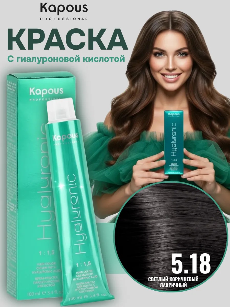 The kit includes only the dye tube; developer is purchased separately. Hyaluronic Acid permanent ammonia dye. Professional cream hair dye with hyaluronic acid, Hyaluronic Kapous Professional. The new, revolutionary formula of Hyaluronic Acid dye from Kapous includes low-molecular hyaluronic acid and an innovative care complex that provide maximum hydration, preservation, and restoration of hair structure during coloring. Hyaluronic acid effectively reconstructs damaged hair cuticles, smoothing hair along the entire length. An exclusive cocktail of micromolecule pigments forms a dense network that allows for perfect hair coverage, color durability, silkiness, and brilliant shine after coloring.