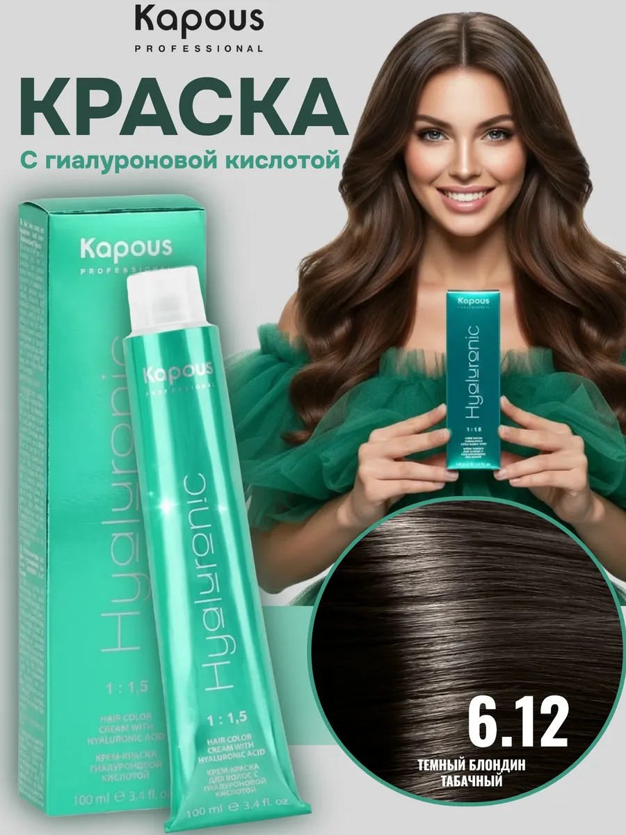 The kit includes only the dye tube; developer is purchased separately. Hyaluronic Acid permanent ammonia dye. Professional cream hair dye with hyaluronic acid, Hyaluronic Kapous Professional. The new, revolutionary formula of Hyaluronic Acid dye from Kapous includes low-molecular hyaluronic acid and an innovative care complex that provide maximum hydration, preservation, and restoration of hair structure during coloring. Hyaluronic acid effectively reconstructs damaged hair cuticles, smoothing hair along the entire length. An exclusive cocktail of micromolecule pigments forms a dense network that allows for perfect hair coverage, color durability, silkiness, and brilliant shine after coloring.