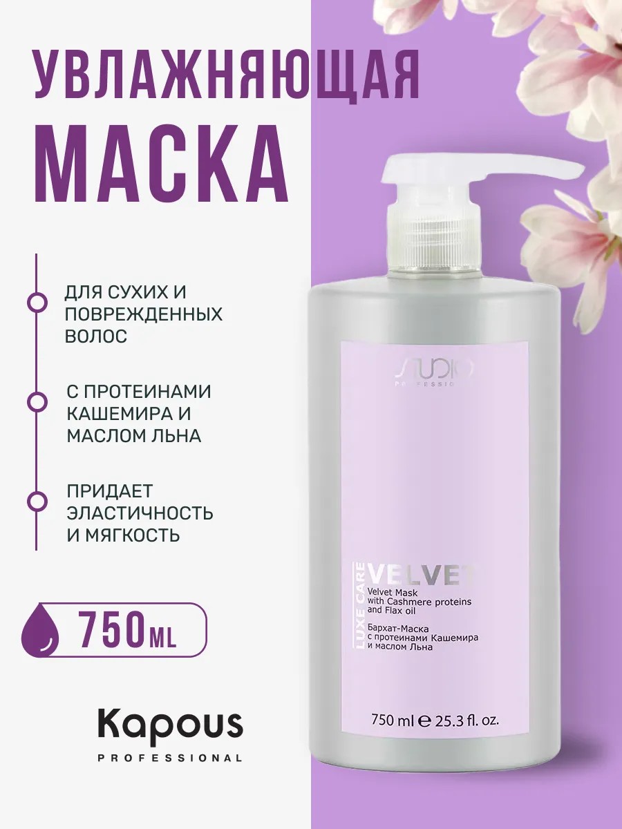 Профессиональная бессульфатная маска для сухих волос Kapous Luxe Care Velvet содержит гидролизованный шёлк (протеины шелка) и масло льна, которые максимально увлажняют и удерживают влагу в волосах продолжительное время, смягчают жёсткие волосы, придают эластичность и мягкость. Протеины шелка также способствуют сохранению влаги, активно участвуют в обмене веществ и биохимических процессах в клетках, смягчает и питает, укрепляет волосы, способствует сохранению естественного уровня увлажненности, предупреждает появление секущихся кончиков. В составе льняных семян содержится олеиновая, пальмитиновая, арахиновая, стеариновая, миристиновая и линолевая кислоты, а также витамины D, Е, А, протеины, керамиды, омега 3 и омега 6. Такой состав делает его идеальным увлажняющим компонентом, поэтому хлопковое масло станет незаменимым помощником для тех, у кого слабые, тусклые, ломкие и безжизненные волосы. Кроме того, масло хлопка действует как натуральная защита, окутывая каждый волосок тонкой пленкой, которая защищает от потери влаги, перепада температур, механического внешнего воздействия, холодного и горячего воздуха. Итальянское средство Studio - это мощное восстанавливающее средство для сухих и поврежденных волос, которое отлично увлажняет и питает, укрепляет структуру. Продукт студио подойдёт любому типу волос, особенно сухим, окрашенным и повреждённым. В состав входит широкий ассортимент питательных веществ для здоровья кожи головы и ухода за волосами. Kapous маска содержит оптимальный баланс кислотности, улучшает состояние волос и кожи головы, уменьшает ломкость, предотвращает появления перхоти, волосы становятся ровными, упругими, блестящими. Восстанавливает даже сильно поврежденные волосы, подходит даже для кудрявых волос, проникая глубоко в структуру сухих и ломких волос, возвращает волосам мягкость, шелковистость и блеск. Отлично подойдет к набору в подарок на 14 февраля - день святого Валентина, 8 марта, день рождения девушкам, женщинам и мужчинам!