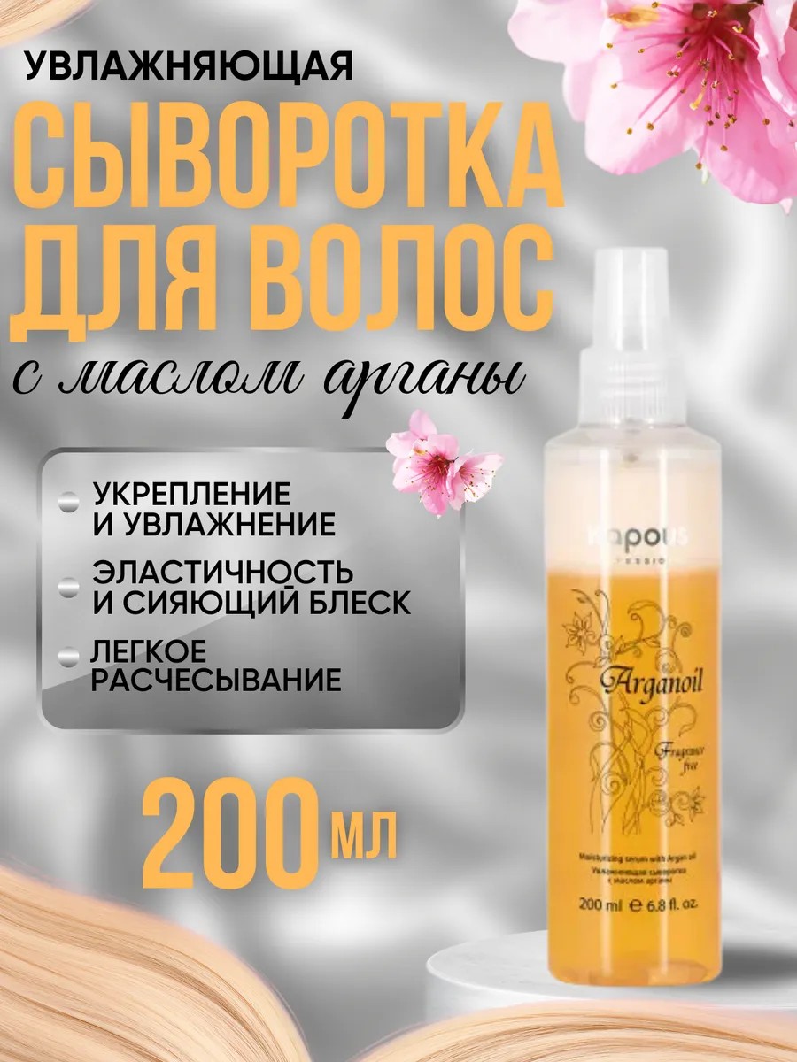 Серия Fragrance free не имеет парфюмированных добавок. Двухфазная сыворотка спрей Капус на основе масла Арганы, кератина и молочной аминокислоты разработана специально для увлажнения и восстановления волос всех типов. Новая формула спрея для волос kapous эффективно защищает волосы от негативного воздействия агрессивных факторов внешней среды, обеспечивая интенсивное увлажнение. Масло Арганы в пшикалке для волос богато полиненасыщенными жирными кислотами, которые оказывают продолжительный увлажняющий эффект и укрепляют волосы, делая их более эластичными и блестящими. Природные антиоксиданты (полифенолы и токоферолы) защищают волосы от воздействия свободных радикалов, витамины А и Е стимулируют усиленную регенерацию клеток, реконструируют внутреннюю структуру, максимально напитывая волосы и возвращая эластичность и силу. Несмываемый двухфазный спрей для волос Капус отличное средство для увлажнения и укладки волос.
