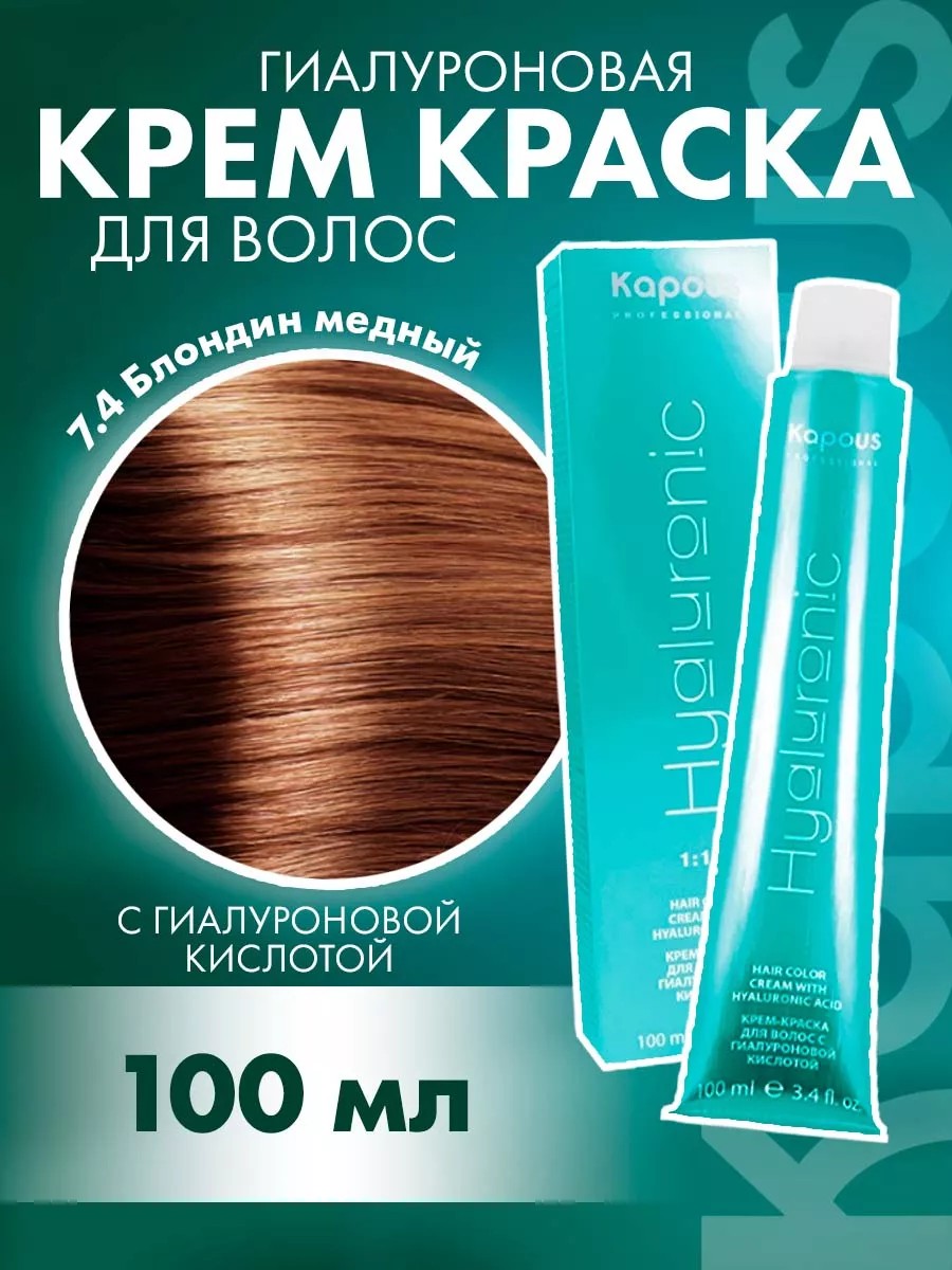 Hyaluronic Acid Cream Hair Color from Kapous Professional. This professional hair color contains an innovative care complex with hyaluronic acid, which provides hydration, restoration, and preservation of hair structure during coloring. The color is an effective humectant, providing incredible softness and protection during thermal styling. Hyaluronic acid in Kapous color effectively reconstructs damaged hair cuticles, smoothing hair along the entire length. An exclusive cocktail of micromolecule pigments forms a dense network, allowing for perfect hair coverage, color fastness, silkiness, and brilliant shine after coloring. A sensitivity test is recommended before coloring.