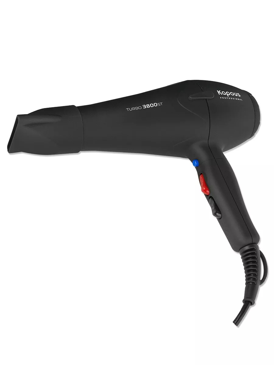 Professional hair dryer with increased power, model "Turbo 3800ST" Kapous Professional. Due to the elongated body, power and distribution of air flow, drying (styling) time is reduced by up to 30%. Thanks to the Soft Touch coating and ergonomic handle, the hair dryer is pleasant and comfortable to hold in your hand. The front location of the adjustment buttons allows you to work with both left and right hands. The weight, power and low noise of the hair dryer provide comfortable hair styling. Ideal for long and complex styling! TECHNICAL SPECIFICATIONS: Model - "Turbo 3800ST" Power voltage: 230-240 V Electric power: 2300-2500 W Air flow power: 99.90 cu.m/h Noise level: 69 dB Cord length: 3 m Weight: 647 g The hair dryer has 2 speeds, 3 temperature modes and an instant cooling button. - Extended body - Two nozzles - Soft Touch coating Use the hair dryer only for drying and styling hair: • Dry your hair with a towel before use; • Plug in the hair dryer, set the air speed switch (black) to the desired mode, then set the temperature switch (red) to the desired heat position. Turn off the hair dryer in the reverse order; • Try not to hold the hair dryer too close to your hair and head. Cold air button - when you press the button, the air cooling function is activated, which stops heating the spiral. This function allows you to cool the dried strand (hair) to fix the shape of the hairstyle, as well as to add volume to the hair. Use this function at the final stage of drying your hair.