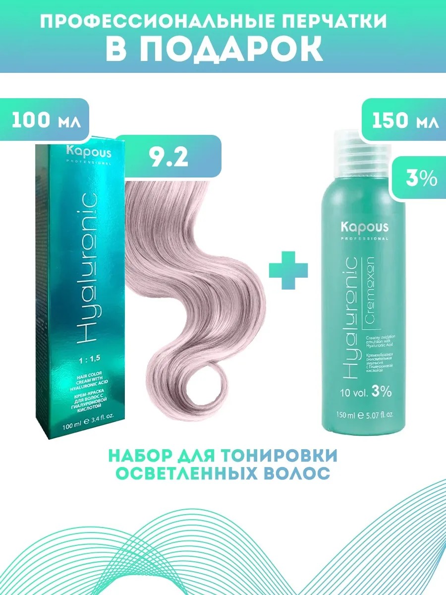 Kapous Professional Промо-спайка Крем-краска для волос Hyaluronic, тон №9.2, Очень светлый блондин фиолетовый, 100мл + оксид KAPOUS 3%, 150мл