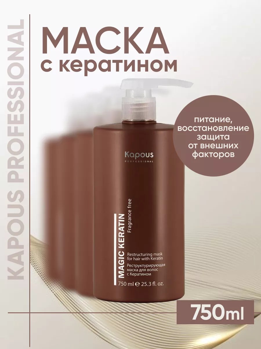 Маска для всех типов волос. Маска Кератин идеально подходит для ухода за пористыми, осветленными, окрашенными и поврежденными волосами после химической завивки и кератинового выпрямления. Восстанавливает эластичность и блеск поврежденным волосам. Протеины Пшеницы восполняют недостаток питательных веществ, способствуя укреплению защитного слоя волоса. Гидролизованный Кератин проникает в структуру волоса,восстанавливает повреждения изнутри,повышает упругость и придает блеск. Кератиновая маска подойдет для сухих, окрашенных и поврежденных волос, так как в результате применения она восполняет дефицит кератина и закрепляет его, что гарантирует предотвращение появления секущихся кончиков и ломкости , а также останавливает преждевременное старение и выпадение волос.Структура волос становится плотнее, снижается пористость. Маска реструктурирующая легко и равномерно наносится, не растекается, обладает нейтральным, приятным запахом.При использовании маски с дозатором Kapous Magic Keratin регулярно, волосы становятся более крепкими и эластичными, что позволяет им лучше выглядеть и дольше сохранять свой здоровый вид. Реструктурирующая маска для волос с кератином увлажняющая Kapous Fragrance free – это отличный выбор для тех, кто хочет улучшить состояние своих волос и сохранить их здоровый вид. Маску от Kapous Professional можно использовать с шампунем, кондиционером и бальзамом серии Magic Keratin.