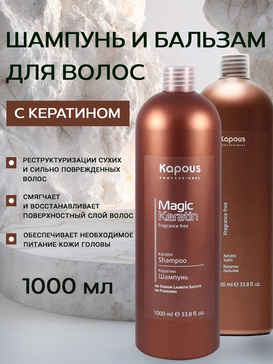 Шампунь для волос , бальзам для волос Kapous «Magic Keratin» для уставших, утративших жизненную силу, химически выпрямленных или завитых волос, а также подверженных неоднократным процедурам окрашивания и обесцвечивания, предназначен для решения трёх важных задач: питание и восстановление, лечение поврежденных волос, защита. Благодаря входящим в состав Кератину и фруктовым кислотам питает и защищает поврежденные волосы, придавая жизненную силу и тонус. Модифицированные фруктовые кислоты служат для смягчения волос, увлажняют и придают дополнительный блеск, кератин восстанавливает и придает эластичность. Полиненасыщенные аминокислоты обеспечивают необходимое питание коже головы, предотвращают скопление свободных радикалов. Бессульфатный бальзам не имеет отдушек и ароматизаторов. Бальзам Капус содержит масло Карите и Кератин благодаря этому восстанавливается и смягчается поверхностный слой волос. После использования средств Кератина Kapous волосы становятся, шелковистыми, послушными, устраняется пушение и облегчается расчесывание.