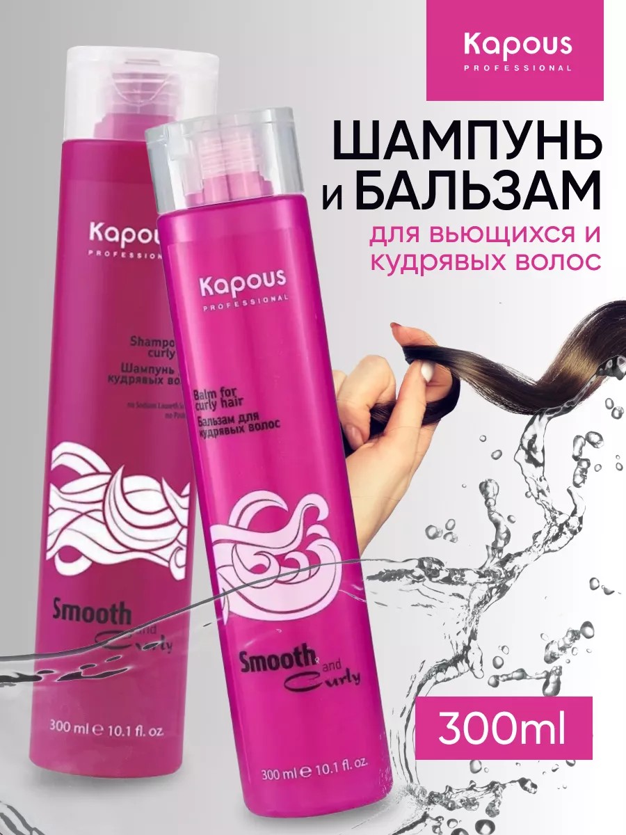 Набор: шампунь и бальзам Smooth and Curly для кудрявых волос от Kapous Professional . Шампунь предназначен для легкого бережного очищения волнистых и вьющихся волос. Профессиональный косметический продукт предназначен специально для женщин, которые ценят красоту и натуральность своих кудряшек. Эффективно увлажняет, предотвращает спутывание, разглаживает кутикулу, придаёт волосам ухоженный вид и красиво очерченные локоны. Товар Капус профессионал мягко очищает кожу головы, питает и увлажняет пористые и поврежденные волосы, придавая им блеск, силу и защиту от внешних вредных воздействий, включая солнцезащитный эффект. Входящие в состав Протеины Шёлка и Пшеницы образуют тонкую защитную пленку, оказывают эффективное увлажняющее и восстанавливающее действие, защищают от УФ-лучей. После первого применения волосы становятся мягкими и шелковистыми, убирает пушистость. Бальзам предназначен для ухода за вьющимися волосами. Обеспечивает увлажнение, укрепление, восстановление и защиту ваших волос, делая их сильными и здоровыми. Уникальная формула борется с ломкостью и обеспечивает волосам блеск и легкое расчесывание. Уходовая комбинация протеинов Шёлка и фруктовых кислот обеспечивает идеальный уход за кудрявыми волосами, делает их эластичными, упругими. Аминокислоты протеинов Шёлка восстанавливают поврежденные участки волос, структурируют локоны. При регулярном применении бальзама волосы становятся блестящими и шелковистыми, а кудри подвижными и упругими. Ополаскиватель усиливает ваши кудри, обогащая их мягкой шелковистостью. Нанести уходовый шампунь на влажные волосы. Вспенить в течение 2-4 минут, смыть. После использования шампуня для кудрявых волос равномерно нанести бальзам на влажные волосы. Оставить на 3-5 минут, смыть. Подходит для ежедневного применения. Подходит для всех типов волос, включая тонкие и поврежденные.
