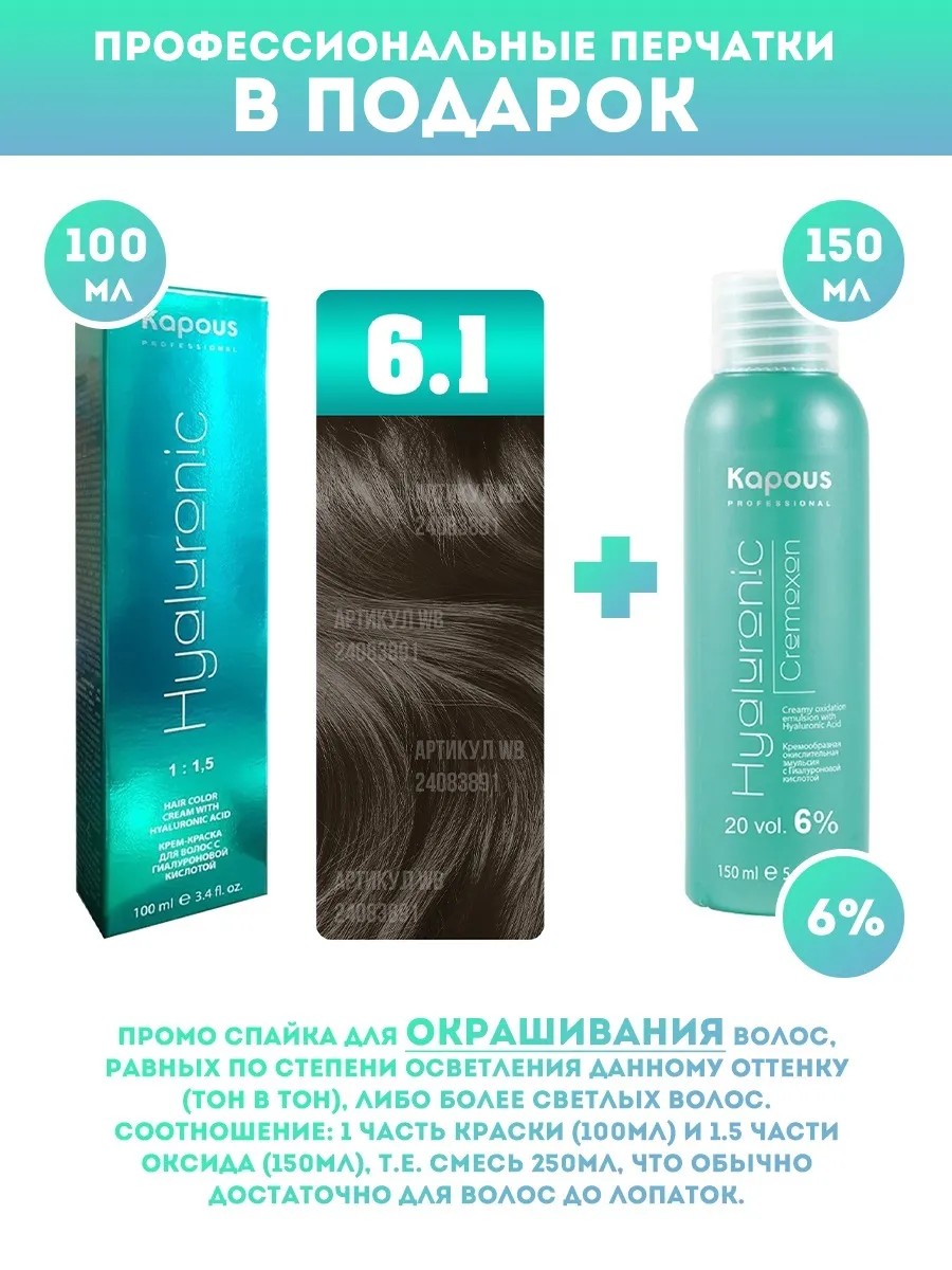 | Полное наименование товара | Kapous Professional Промо-спайка Крем-краска для волос Hyaluronic, тон №6.1, Темный блондин пепельный, 100мл + оксид KAPOUS 6%, 150мл |