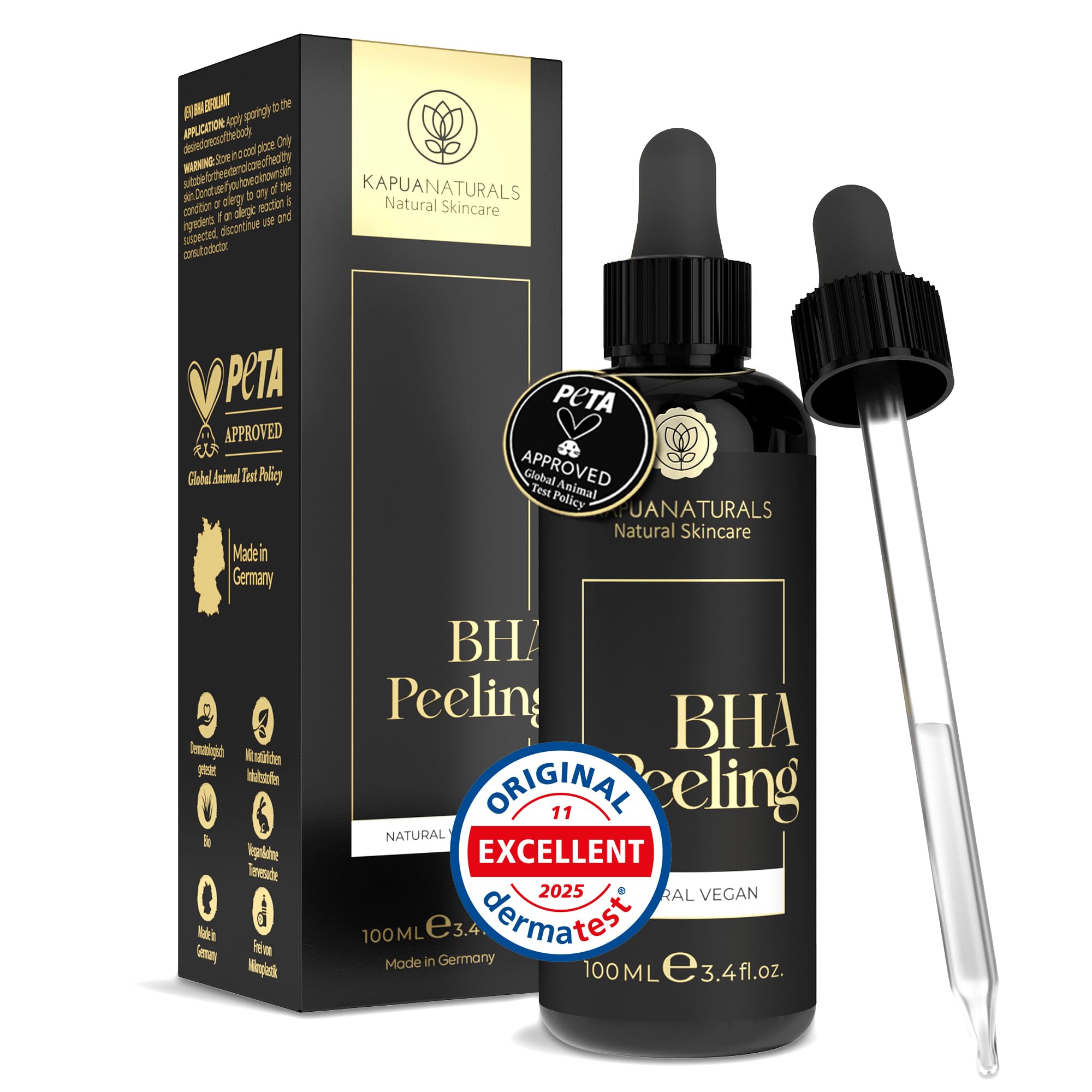 MADE IN GERMANY ORGANIC ALOE VERA BASED XL PURPLE GLASS BOTTLE (100 ml) – Developed and manufactured in Germany to high quality standards. The formula replaces water with organic aloe vera, known for its skincare properties. The UV-resistant purple glass bottle protects the active ingredients, is sustainable, recyclable, and plastic-free. At 100 ml, this peel contains significantly more product than many comparable scrubs (often only 30 ml) and lasts for several months – for clear, healthy skin without the need for constant repurchase. SMART DISPENSER SYSTEM – Organic aloe vera gel xanthan microgel: The natural hydrogel network based on organic aloe and xanthan gum distributes the BHA AHA particularly evenly, prolongs contact time with the skin, and significantly filters the acids – for gentler exfoliation, less stinging, and a visible radiance. LESS IRRITATION – Chamomile and green tea extracts quickly soothe, reduce redness, and provide a particularly gentle peeling experience. Combined with organic aloe vera and hyaluronic acid, the complex buffers acids, provides hydration, and strengthens the skin barrier – for less irritation, soothed skin, and a visibly clearer complexion. Dermatologically tested by Dermatest and rated "excellent." MULTI-FRUIT AHA COMPLEX – Salicylic acid combined with extracts of sugar cane, blueberry, orange, sugar maple, and lemon delivers effective fruit acids that remove dead skin cells, tighten the appearance of pores, and leave skin smooth and radiant. Ideal for combination, oily, and blemish-prone skin: soothing aloe vera, chamomile extract, and hyaluronic acid intensely hydrate, reduce redness, and provide effective exfoliation without drying or irritation. PEEL PROTECT SYSTEM – Intelligent and unique dual action: 2 salicylic acid (BHA) and AHA fruit acids gently dissolve dead skin cells and refine pores, while the soothing complex strengthens and calms the skin barrier – for fewer blemishes and a visibly clearer, more even complexion.BHA Peeling 2 (100 ml) – Gommage visage BHA AHA • Exfoliant à 2 d'acide salicylique contre points noirs, imperfections pores obstrués • Affine les pores • Blackhead RemoverFABRIQUÉ EN ALLEMAGNE BASE D'ALOE VERA BIO FLACON EN VERRE VIOLET XL (100 ml) – Développé et fabriqué en Allemagne selon des normes de qualité élevées. La formule remplace l'eau par de l'aloe vera bio aux propriétés soin. Le flacon en verre violet anti-UV protège les actifs, est durable, recyclable et sans plastique. Avec 100 ml, le peeling contient nettement plus de produit que de nombreux gommages comparables (souvent seulement 30 ml) et dure plusieurs mois – pour une peau nette et soignée, sans devoir racheter constamment. SYSTÈME DE DIFFUSION INTELLIGENT – Gel d'aloe vera bio micro-gel de xanthane : le réseau d'hydrogel naturel à base d'aloe bio et de xanthane répartit les BHA AHA de manière particulièrement homogène, prolonge le temps de contact avec la peau et tamise sensiblement les acides – pour une exfoliation plus douce, moins de picotements et un éclat visible. MOINS D'IRRITATIONS – Les extraits de camomille et de thé vert apaisent rapidement, réduisent les rougeurs et offrent une expérience de peeling particulièrement douce. Intégré à de l'aloe vera bio et de l'acide hyaluronique, le complexe tamponne les acides, apporte de l'hydratation et renforce la barrière cutanée – pour moins d'irritations, une peau apaisée et un teint visiblement plus clair. Testé dermatologiquement par Dermatest et noté « excellent ». COMPLEXE AHA MULTI-FRUITS – L'acide salicylique associé aux extraits de canne à sucre, myrtille, orange, érable sucre et citron apporte des acides de fruits efficaces qui éliminent les cellules mortes, resserrent l'apparence des pores et laissent une peau lisse et lumineuse. Idéal pour les peaux mixtes, grasses et à imperfections : l'aloe vera apaisante, l'extrait de camomille et l'acide hyaluronique hydratent intensément, atténuent les rougeurs et permettent un gommage efficace sans dessécher ni irriter. SYSTÈME PEEL PROTECT – Double action intelligente et unique : les 2 d'acide salicylique (BHA) et les acides de fruits AHA dissolvent en douceur les cellules mortes et affinent les pores, tandis que le complexe apaisant renforce et calme la barrière cutanée – pour moins d'imperfections et un teint visiblement plus net et uniforme.