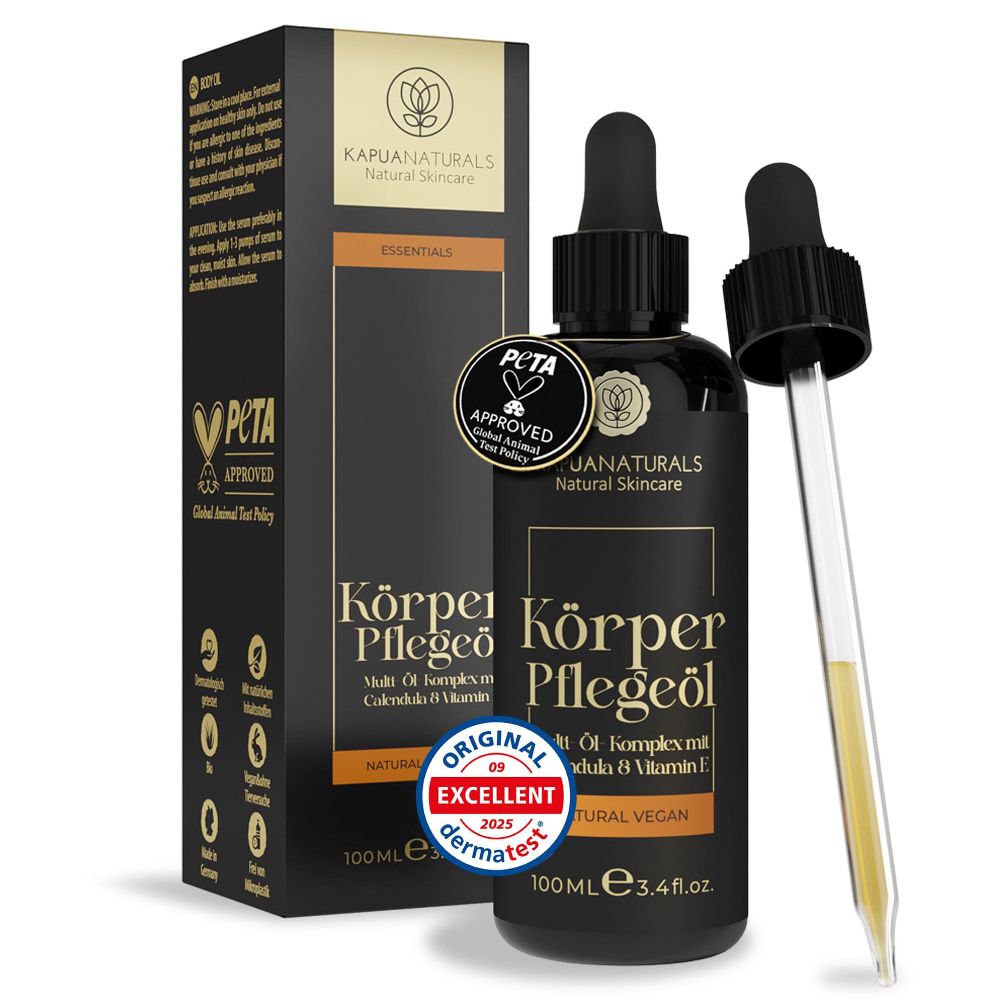 NATURAL COSMETICS FROM GERMANY – 100 vegan, free of parabens, silicones, and microplastics. Made in Germany and packaged in violet glass, which protects the light-sensitive active ingredients and preserves their quality for longer. SATIN FINISH, FAST ABSORPTION – Lightweight formula based on soybean, almond, jojoba, meadowfoam, and sunflower oils: intensely nourishes, improves suppleness, and leaves a silky feel – without a sticky residue. CALM-REPAIR COMPLEX: CALENDULA VITAMINS – Soothes, protects against oxidative stress, and supports the regeneration of stressed skin. Dermatologically tested: DERMATEST "EXCELLENT" – gentle even for sensitive skin. 10-IN-1 SMART MULTI-PURPOSE – Body massage oil, pregnancy care, dry areas (elbows knees), hands nails, bath oil, aftershave, after-sun, booster for tips and radiant legs. Regular massage helps even out skin tone (stretch marks, cellulite scars). HYDRO-LIPID POWER WITH HYALURONIC ACID – Modern formula combining an exclusive oil complex with water-binding hyaluronic acid: visibly plumps, improves elasticity, and leaves skin feeling more supple (retains up to 1000 times its weight in water).Huile corporelle bio hydro-lipidique • Huile pour le corps à l'acide hyaluronique calendula • pour une peau ferme et soignée • vergetures et cellulite • soin des cicatrices huile de massageCOSMÉTIQUE NATURELLE D'ALLEMAGNE – 100 végane, sans parabènes, silicones ni microplastiques. Fabriquée en Allemagne et conditionnée dans du verre violet qui protège les actifs sensibles de la lumière et préserve plus longtemps leur qualité. FINI SATIN, ABSORPTION RAPIDE – Composition légère à base d'huiles de soja, amande, jojoba, meadowfoam tournesol: nourrit intensément, améliore la souplesse et laisse une sensation soyeuse – sans film collant. COMPLEXE CALM-REPAIR : CALENDULA VITAMINEE – Apaise, protège du stress oxydatif et soutient la régénération des peaux sollicitées. Confirmé dermatologiquement: DERMATEST "EXCELLENT" – doux même pour les peaux sensibles. 10-EN-1 MULTI-USAGE INTELLIGENT – Huile pour le corps de massage, soin de grossesse, zones sèches (coudes genoux), mains ongles, huile de bain, après-rasage, après-soleil, booster pour pointes et jambes lumineuses. Le massage régulier aide à un aspect de peau plus uniforme (vergetures, cellulite cicatrices). PUISSANCE HYDRO-LIPIDIQUE AVEC ACIDE HYALURONIQUE – Formule moderne associant un complexe d'huiles exclusif à de l'acide hyaluronique fixateur d'eau: repulpe visiblement, améliore l'élasticité et laisse la peau plus rebondie (retient jusqu'à 1000× son poids en eau).