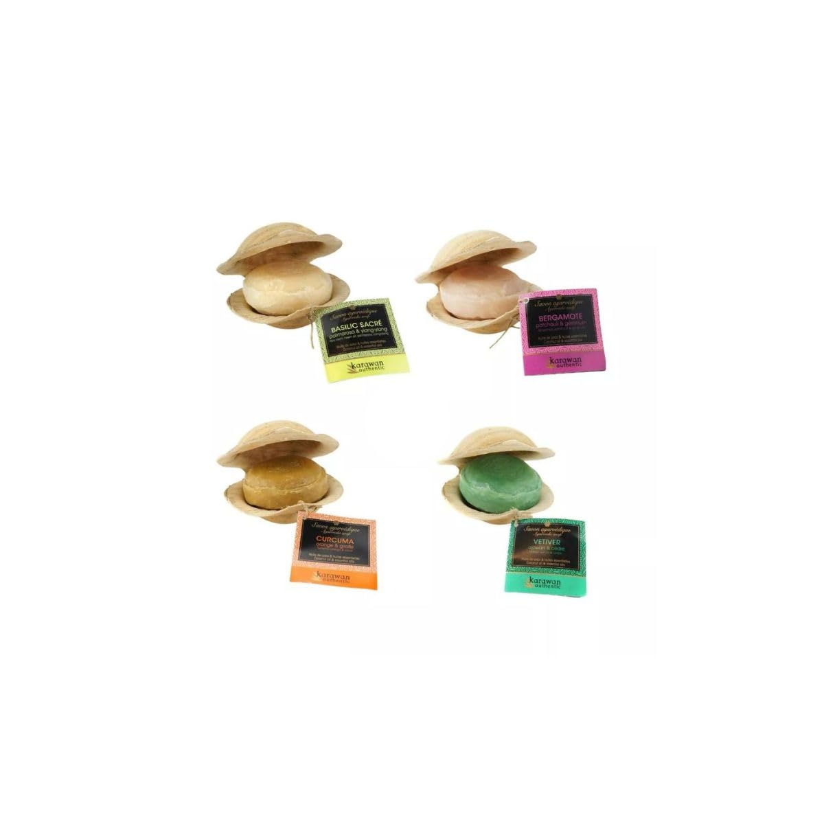 Karawan Authentic Ayurvedic Soaps Coconut oil is cold-pressed, then saponified and blended with a synergy of essential oils and plant extracts known for their properties that are gentle on even the most delicate skin. Thanks to the coconut oil, these soaps produce a rich, light, and creamy lather. They soften fragile or very dry skin. They can also be used as a shampoo. They are made according to pure Ayurvedic tradition, in a small-scale production facility in southern India, certified by Ayurveda, using natural ingredients. Bergamot, Patchouli, Geranium: These three essences are known for their regenerative properties for tired, stressed skin. Also suitable for problem skin, due to their restorative properties. A floral and spicy fragrance, like an offering of exotic bouquets. Coconut oil is cold-pressed, then saponified and blended with a synergy of essential oils and plant extracts known for their properties that are gentle on even the most delicate skin. INGREDIENTS: Sodium Cocoate, Parfum (Fragrance), Citrus Aurantium Dulcis (Orange) Peel Oil, Citrus Bergamia Peel Oil Expressed, Eugenia Caryophyllus (Clove) Bud Oil, Lavandula Angustifolia (Lavender) Oil, Pandanus Odoratissimus Oil, Pelargonium Graveolens (Geranium) Flower Oil, Pogostemon Cablin Leaf Oil, Coumarin. Holy Basil, Neem Oil, Ylang-Ylang. Holy Basil (Ocimum sanctum or Tulsi in India) is a plant revered for its powerful medicinal properties. Its antioxidant properties make it an anti-aging ally, and its detoxifying properties help cleanse the body of external pollution. Soap enriched with neem oil, renowned for its antifungal and antibacterial properties. The coconut oil is cold-pressed, then saponified and blended with a synergistic blend of oils.Karawan - Pack : 6 x 4 savons AyurvediquesDESCRIPTION DU PRODUIT Les savons ayurvédiques Karawan authentic L'huile de coco est pressée à froid, puis saponifiée et mélangée à des synergies d'huiles essentielles et d'extraits de plantes reconnus pour leurs propriétés respectueuses des peaux les plus délicates.Ces savons, grâce à l'huile de coco, donnent une mousse abondante, légère et onctueuse.Ils adoucissent les peaux fragiles ou très sèches. Ils s'utilisent également comme shampoing.Ils sont fabriqués dans la pure tradition ayurvédique, dans une unité de production artisanale du sud de l'Inde bénéficiant de l'agrément "ayurvéda" avec des ingrédients naturels. Bergamote, Patchouli, GéraniumCes 3 essences sont reconnues pour leurs vertus régénératrices pour les peaux fatiguées, agressées. Adapté également pour les peaux à problèmes, du fait de leurs vertus reconstituantes.Un parfum floral et épicé comme une offrande de bouquets exotiques. L'huile de coco est pressée à froid, puis saponifiée et mélangée à des synergies d'huiles essentielles et d'extraits de plantes reconnus pour leurs propriétés respectueuses des peaux les plus délicates. INGREDIENTS: Sodium Cocoate, Parfum (Fragrance), Citrus Aurantium Dulcis (Orange) Peel Oil, Citrus Bergamia Peel Oil Expressed, Eugenia Caryophyllus (Clove) Bud Oil, Lavandula Angustifolia (Lavender) Oil, Pandanus Odoratissimus Oil, Pelargonium Graveolens (Geranium) Flower Oil, Pogostemon Cablin Leaf Oil, Coumarin. Basilic sacré, huile de neem, ylang-ylangLe Basilic sacré (Ocimum sanctum ou Tulsi en Inde) est une plante vénérée pour ses puissantes propriétés médicinales. Les vertus antioxydantes en font un complice anti-âge et ses vertus détoxicantes participent à nettoyer l'organisme de la pollution extérieure. Savon enrichi d'huile de Neem réputée pour ses effets antifongiques et anti-bactériens. L'huile de coco est pressée à froid, puis saponifiée et mélangée à des synergies d'huiles