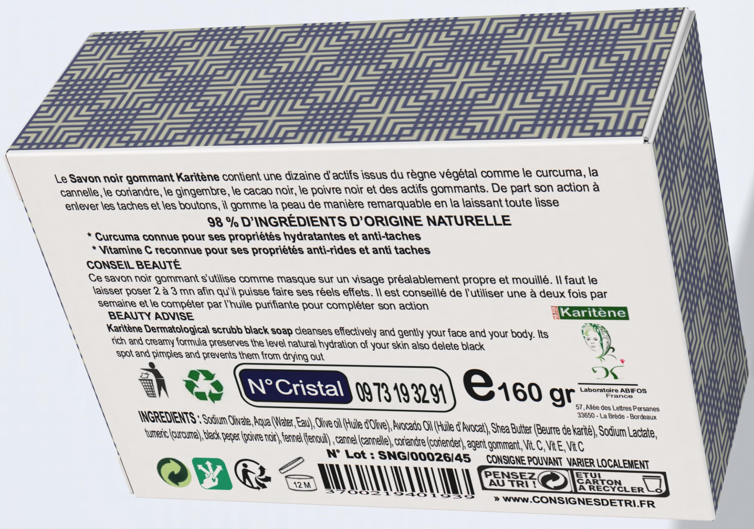 black cocoa, natural shea butter and vitamin C and turmeric scrub soap is a perfect combination of natural ingredients for hydrated, radiant and visibly smoother skin." SAFETY WARNING For external use only, avoid contact with skinBlack scrub soap, shea butter, turmeric, vitamin C, smooth skin, hydrated skin.Zwarte zeep met natuurlijke sheaboter zwarte cacao, natuurlijke sheaboter en vitamine C en kurkuma scrubzeep is een perfecte combinatie van natuurlijke ingrediënten voor een gehydrateerde, stralende en zichtbaar gladdere huid." VEILIGHEIDSWAARSCHUWING Alleen voor uitwendig gebruik, vermijd contact met de huidZwarte scrubzeep, sheaboter, kurkuma, vitamine C, gladde huid, gehydrateerde huid.